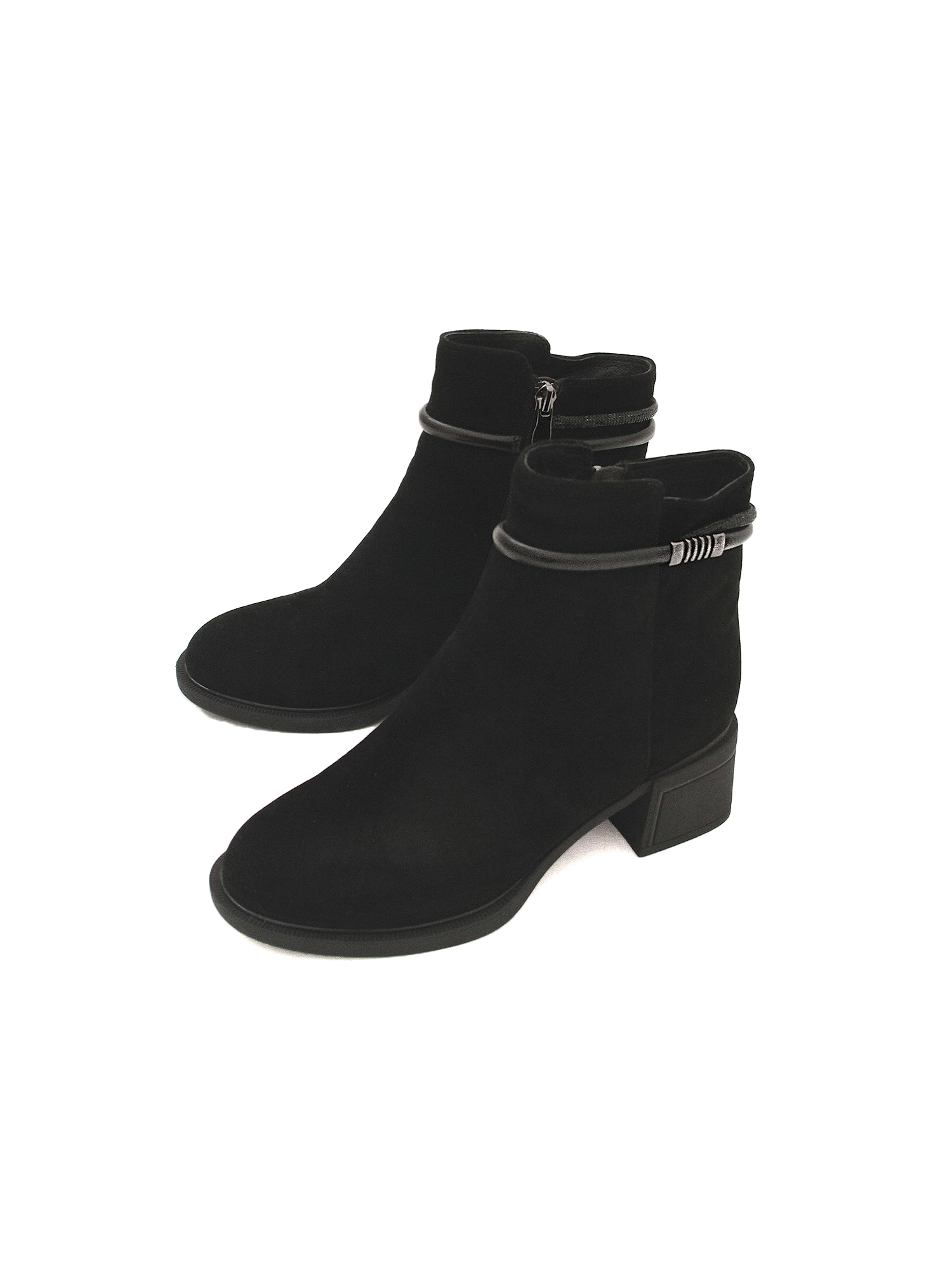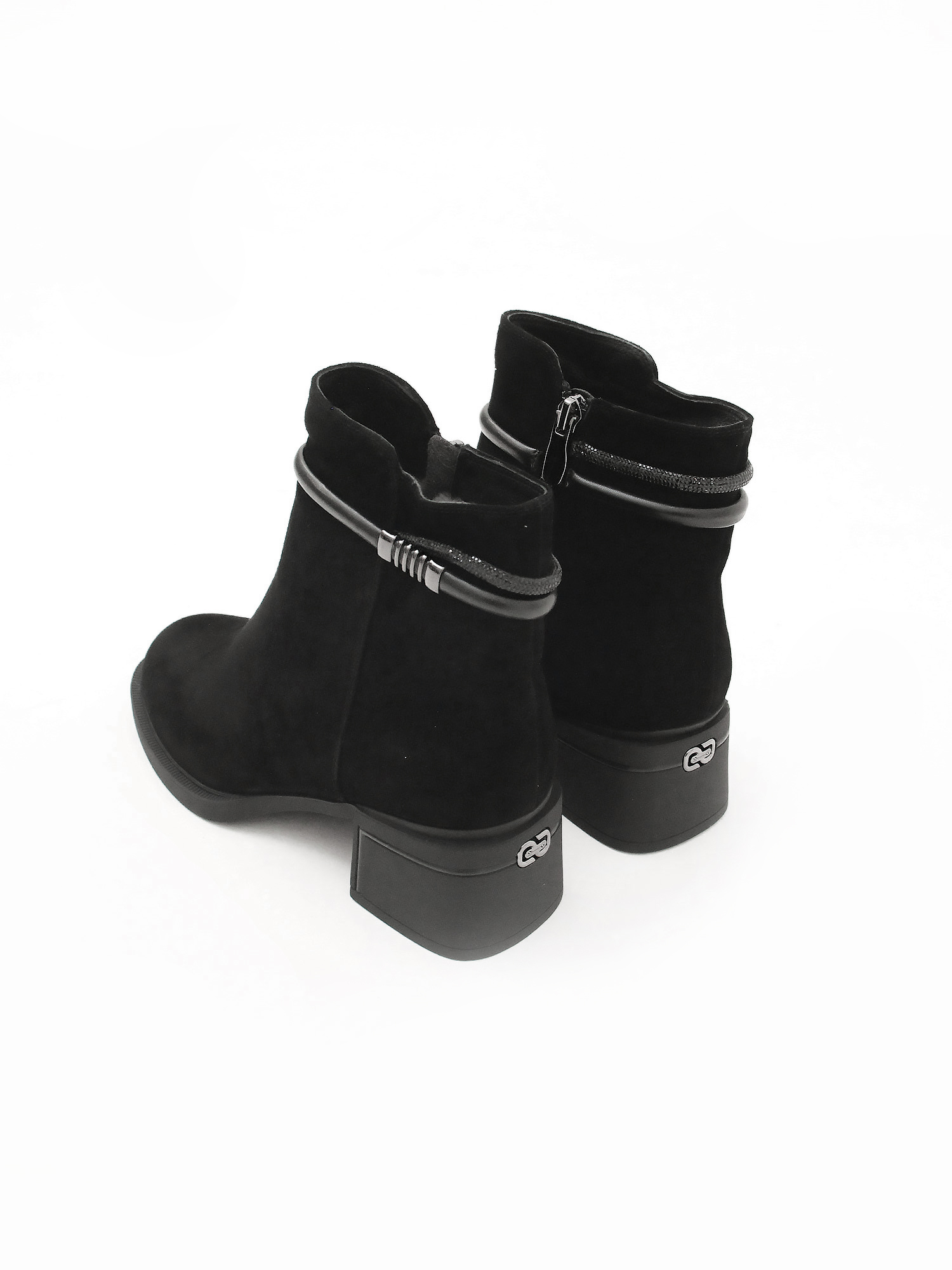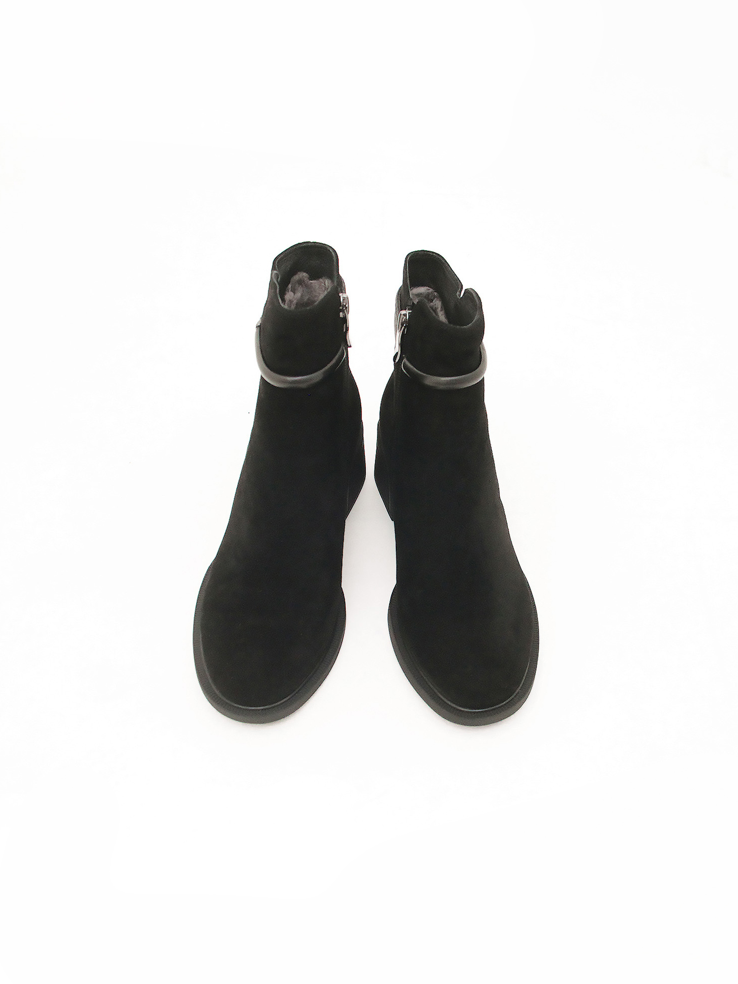 Демисезонные полусопожки из замши утеплённые натуральным мехом. Невысокий устойчивый каблук с металическим акцентом на задней стороне.