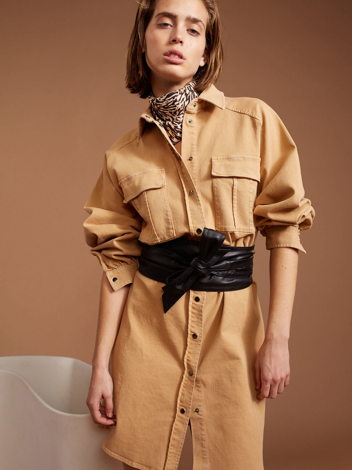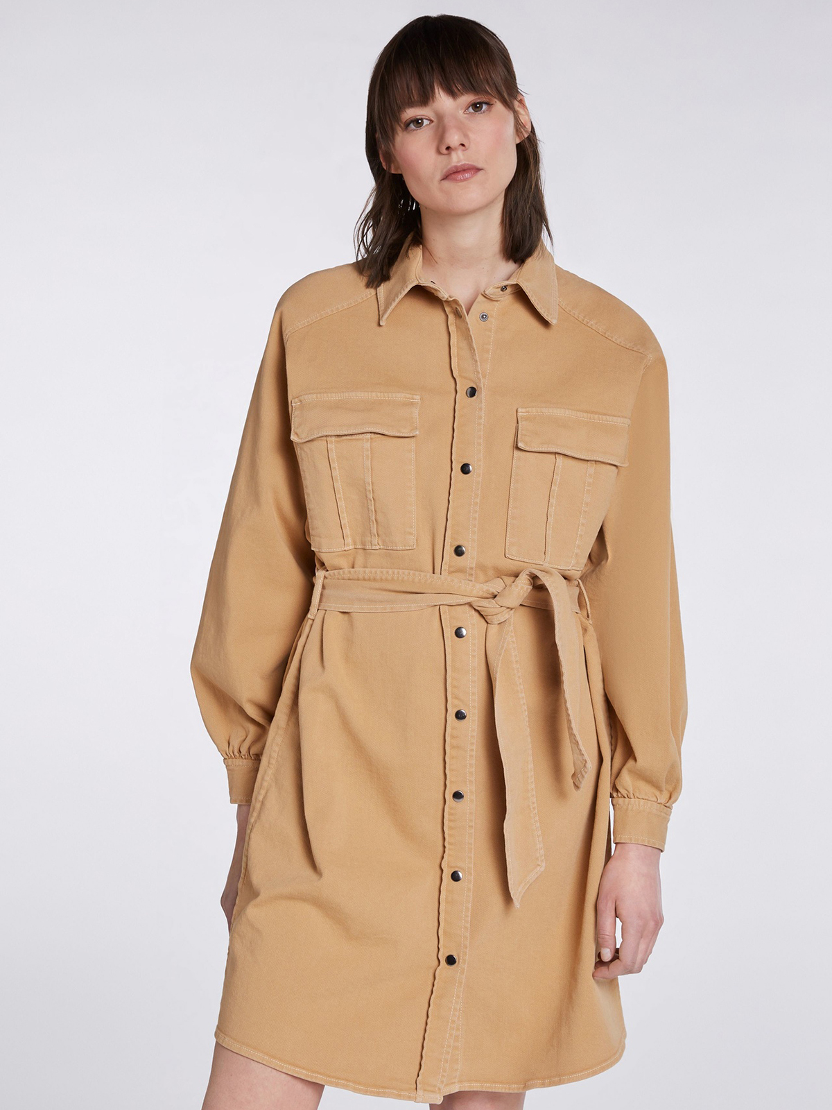 Песочное платье-рубашка из саржевого хлопка. Отложной рубашечный воротник, платка с контрастными пуговицами. Длинный втачной рукав с широкими манжетами. Объемныме накладные карманы на груди. Длина 42 размера: 98 см. Рост модели 178 см, ее размер - 42 (российский).