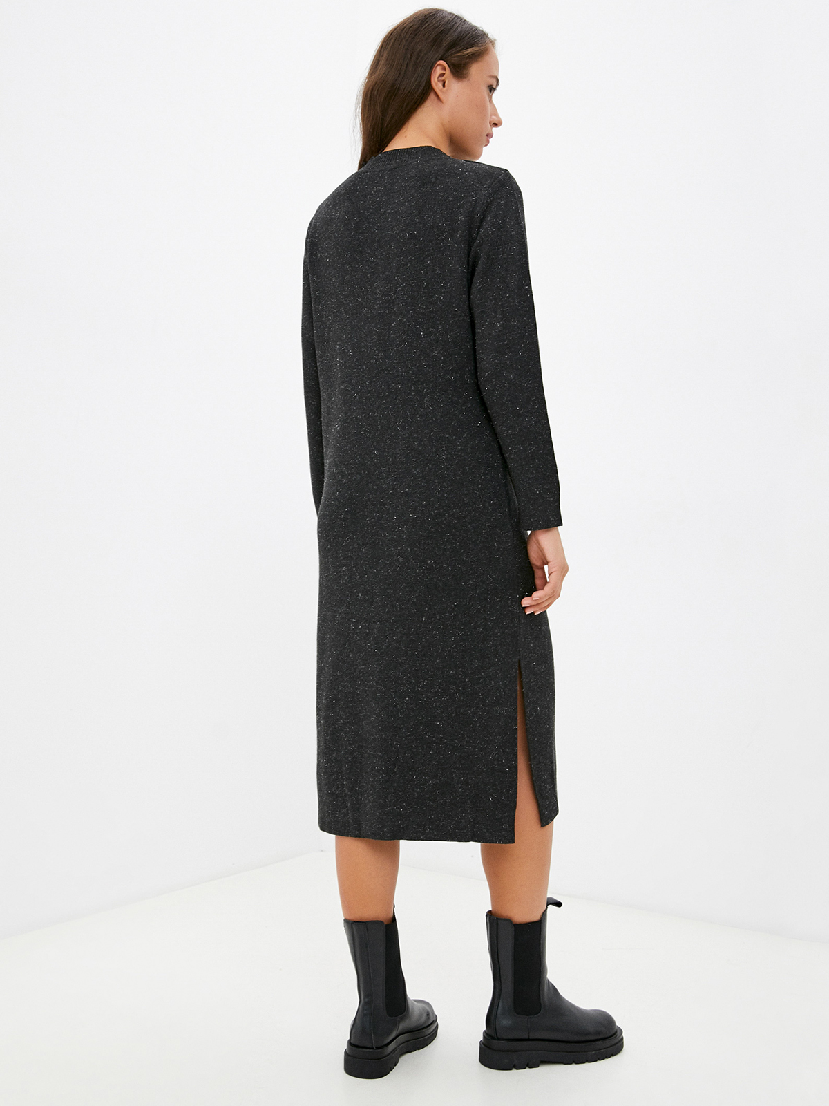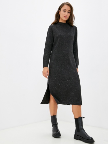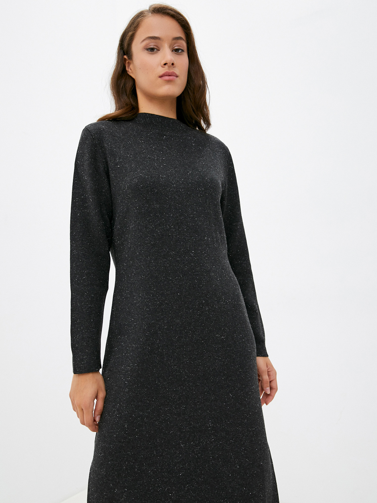 Закрытое однотонное платье длины миди. Круглый вырез горловины, длинный втачной рукав. Прямой силуэт подходит для любого типа фигуры. Нить люрекса в составе материала придает легкое мерцание наряду.