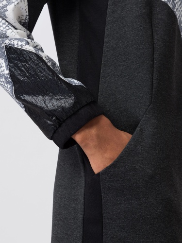 Стильное экстравагантное платье в спортивном стиле со вставками в питоновом узоре и экокоже. Длина мини, полуприталенный силуэт. Широкий воротник стойка украшен надписью.