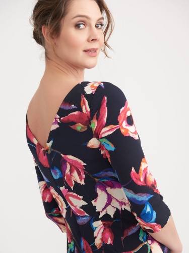 Платье миди с цветочным узором по всей поверхности изделия. Приталенный силуэт, длина до колена. Овальная горловина, V-образный вырез на спинке, втачной рукав 3/4.