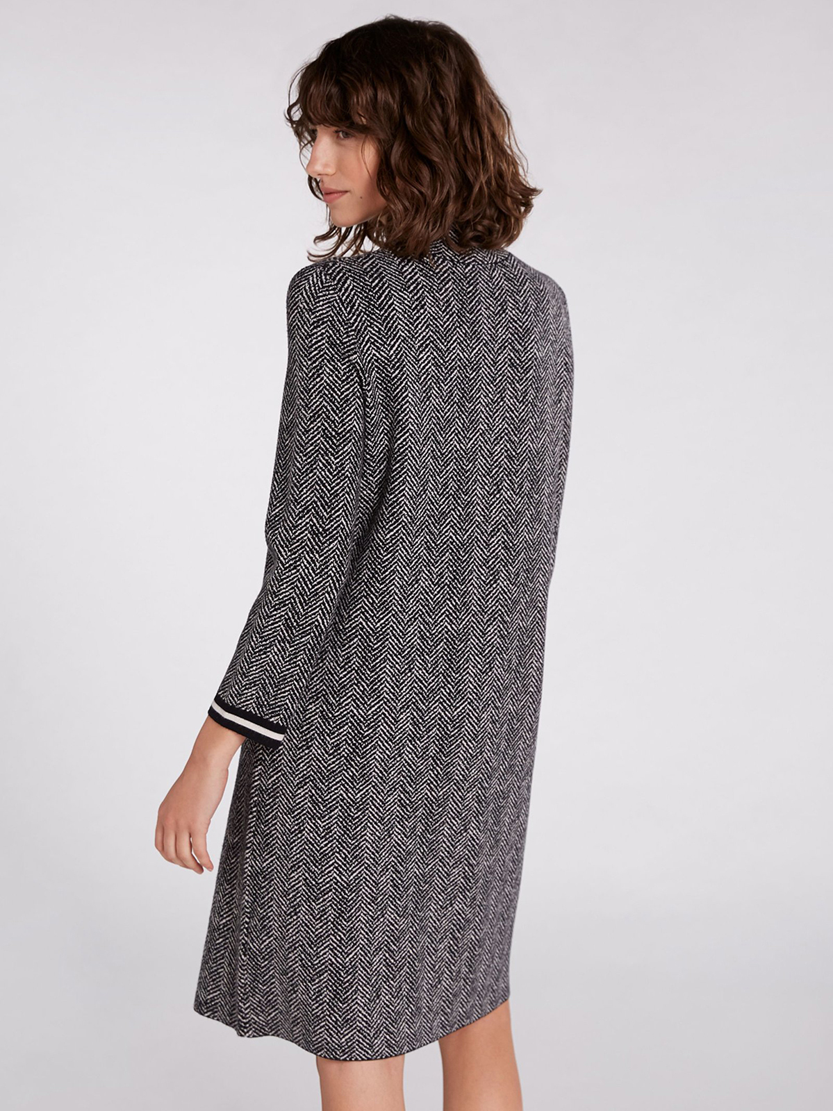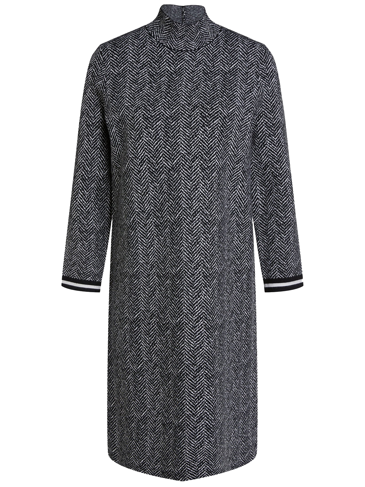 Платье прямого кроя с узором в елочку по всей поверхности изделия. Воротник стойка, длинные втачные рукава с контрастными манжетами.