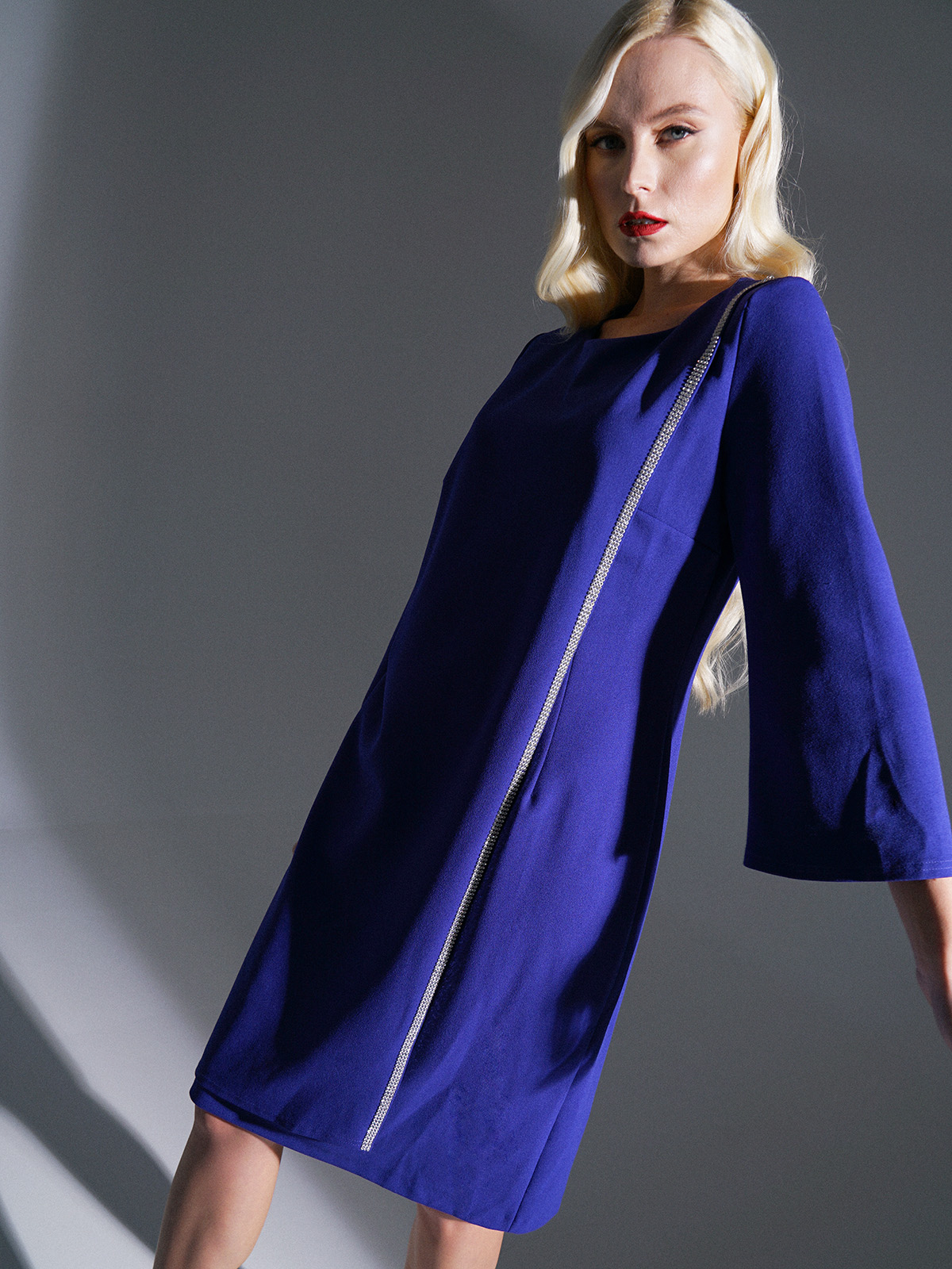На сайте указаны российские размеры. Однотонное платье оригинального кроя. Роскошный и насыщенный оттенок синего, декор лентой серебряного цвета по борту запаха. Расклешенный рукав 3/4.