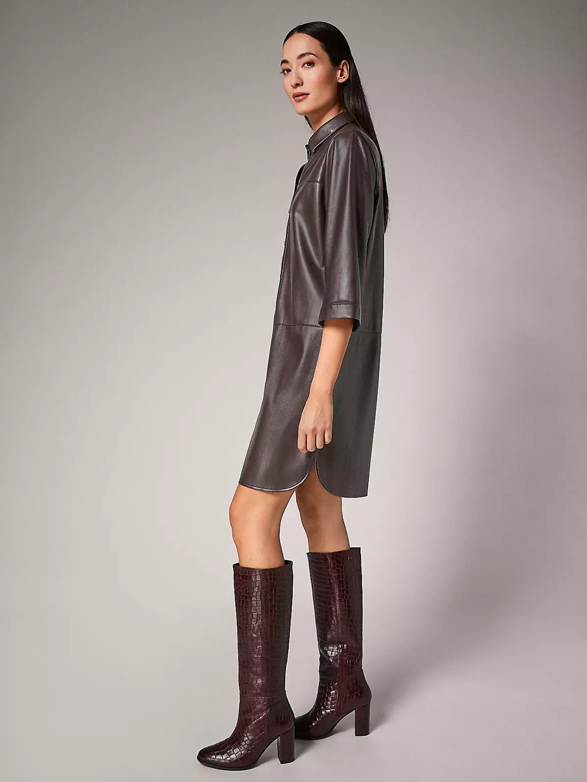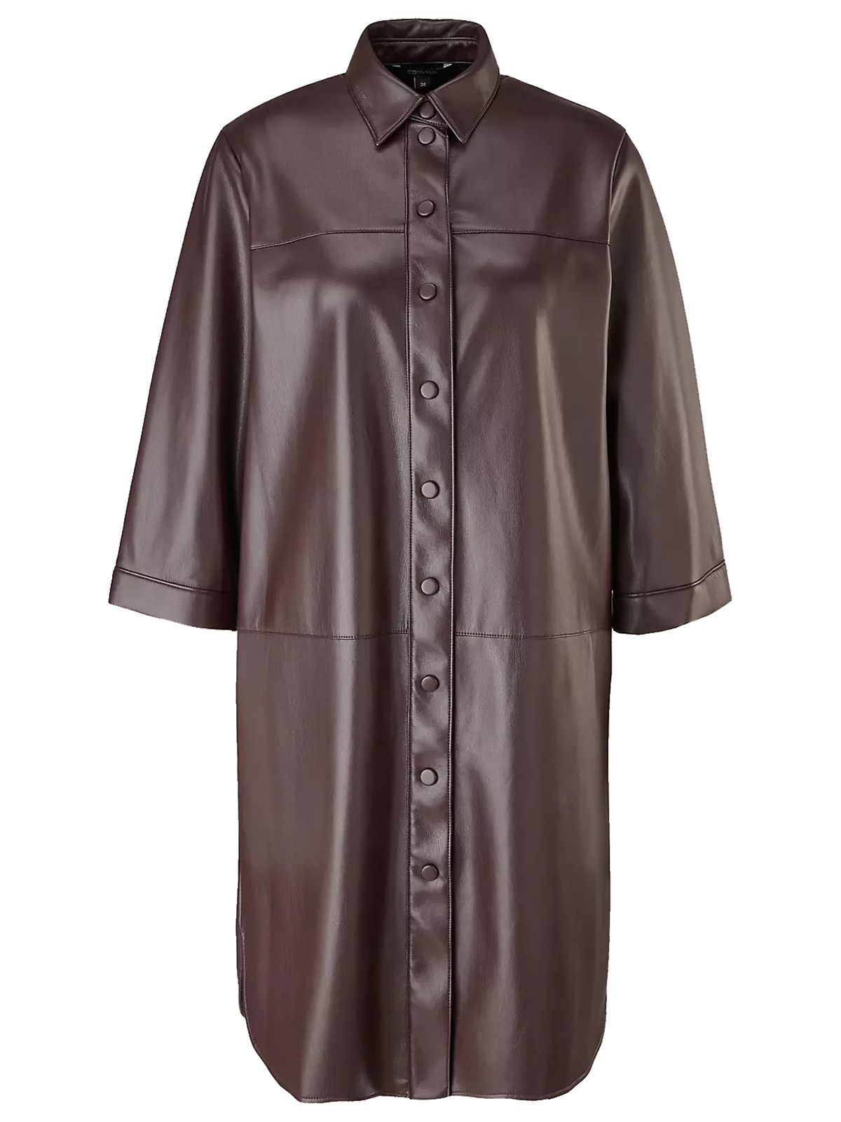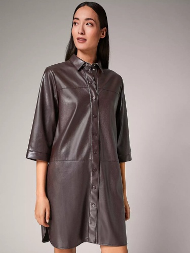 Мини платье-рубашка из экокожи шоколадного оттенка. Отложной рубашечный воротник, планка с пуговицами в тон изделия. Втачные рукава длиной 1/2. Закругленный срез подола, небольшие разрезы по бокам.