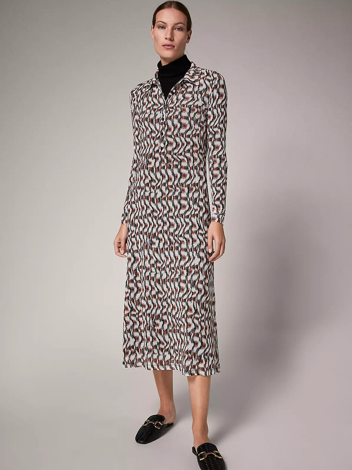 Платье миди длины с абстрактным геометрическим узором по всей поверхности изделия. Полуприталенный силуэт. Отложной рубашечный воротник, планка с пуговицами. Длинный втачной рукав. Платье подойдет для образов в повседневном городском стиле.
