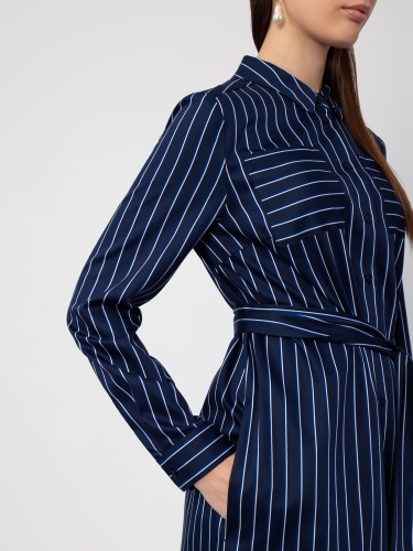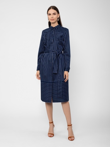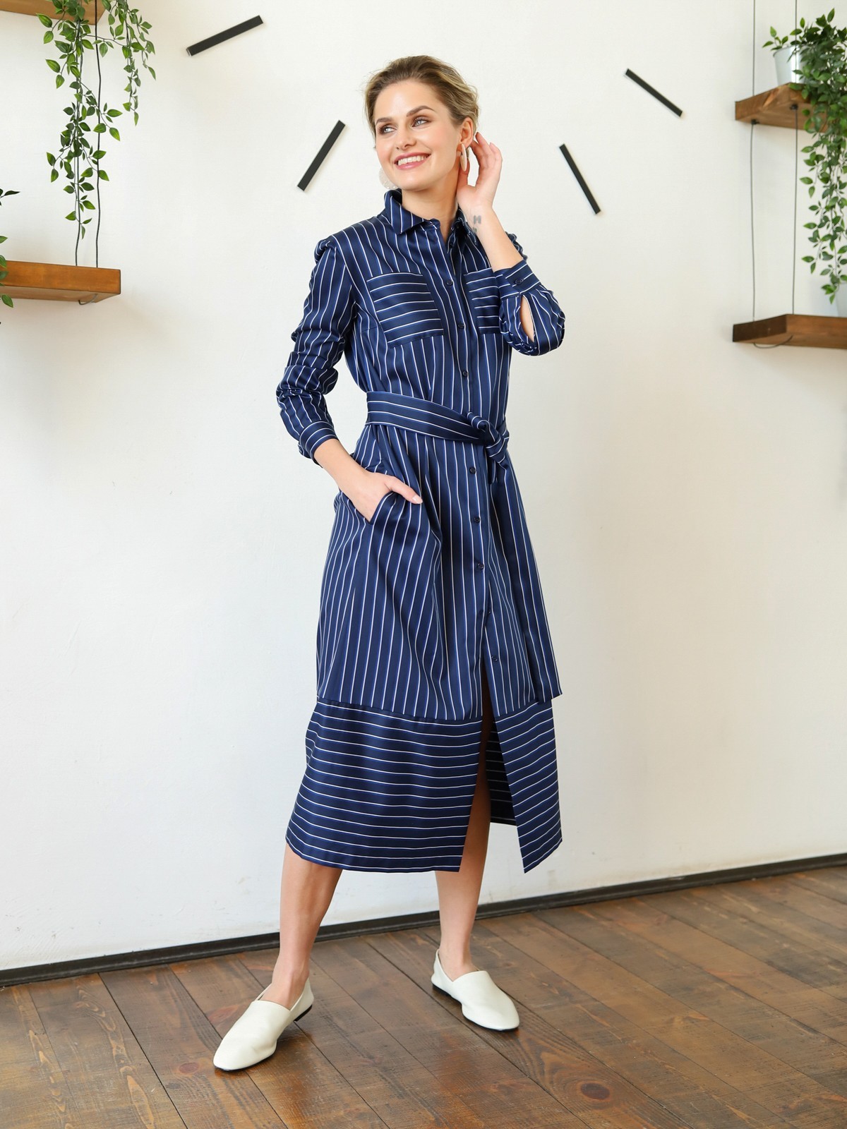 Платье в полоску длины миди прямого силуэта с классическим отложным воротником и втачным рукавом полной длины с манжетами. Спереди застежка на пуговицы и прямоугольные накладные карманы. На талии съемный пояс из основной ткани.