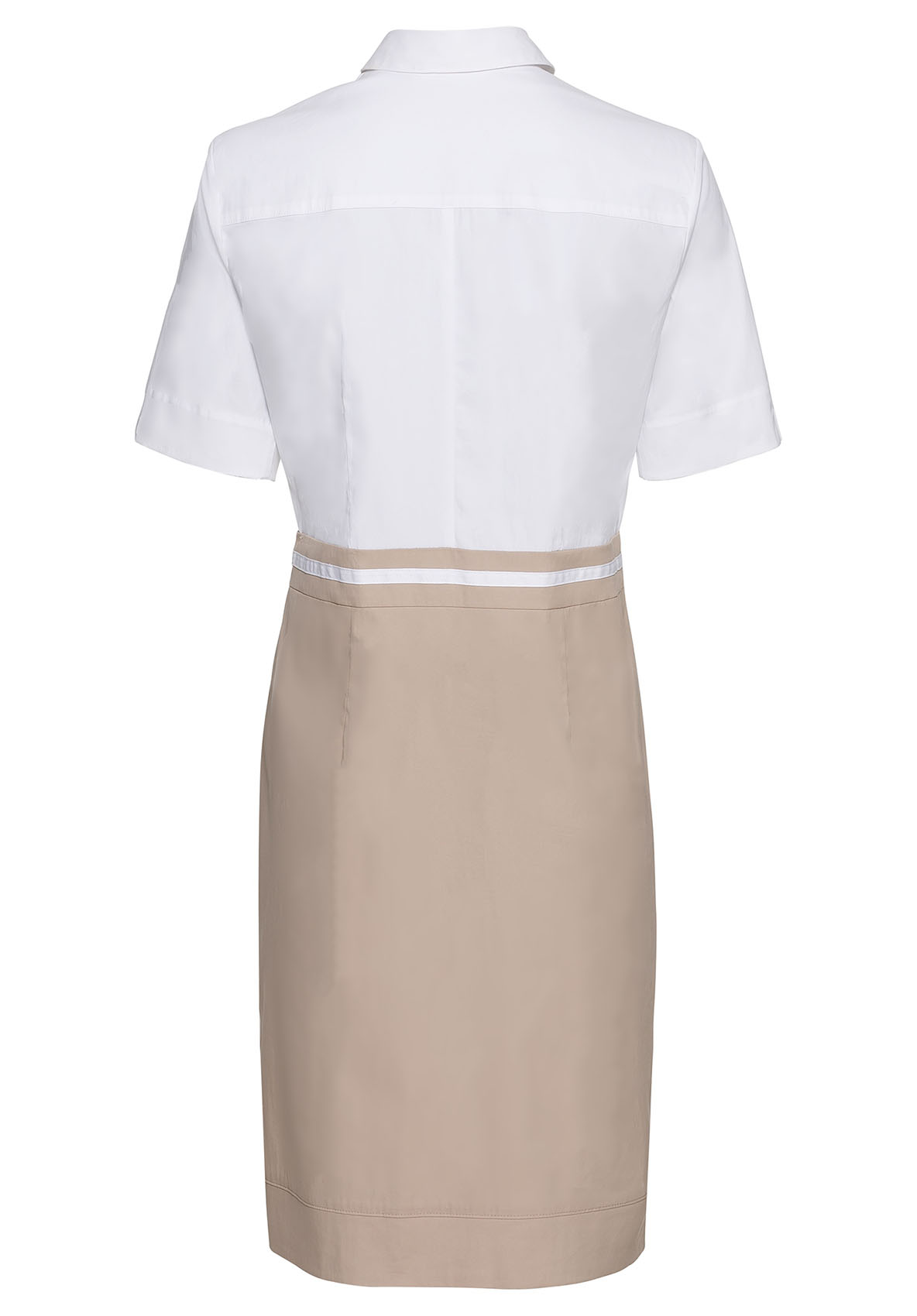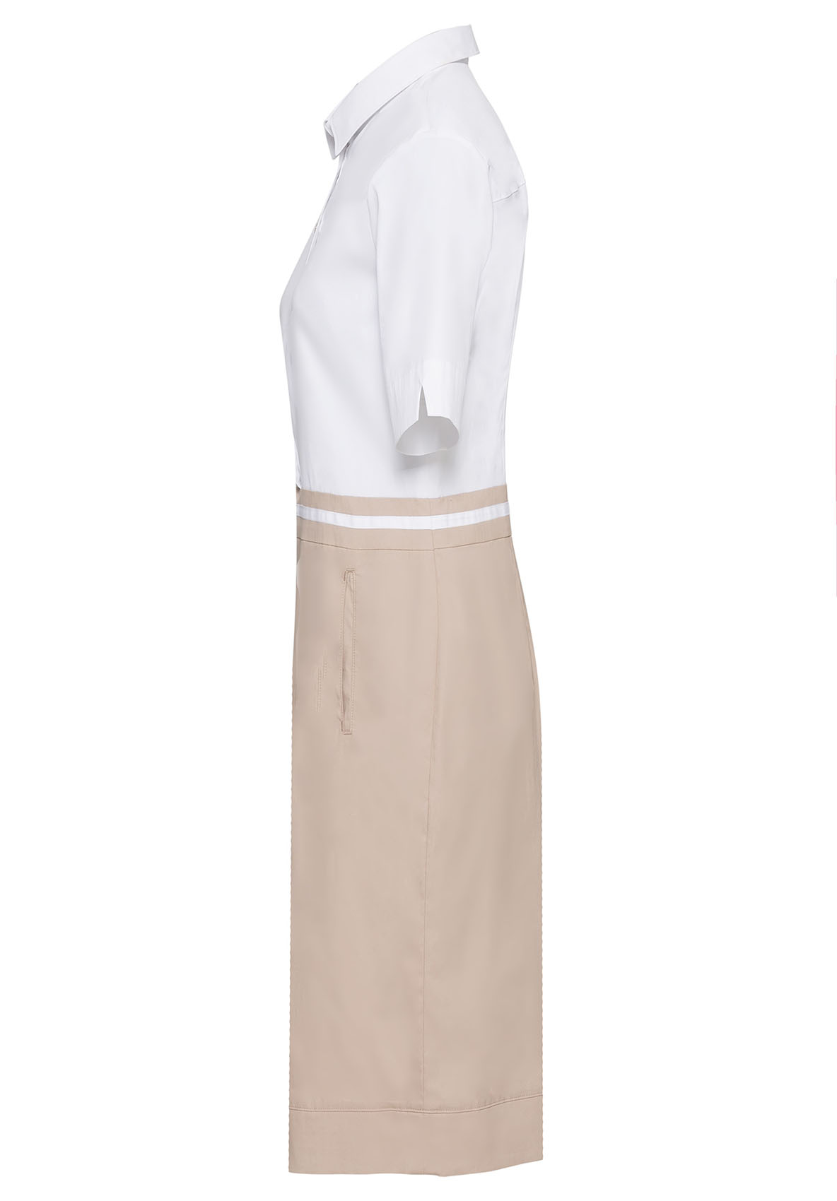 Стильное платье-рубашка Arina создает образ, спортивный и элегантный одновременно. Особенность платья в том, что оно оптически разделено на блузку и юбку. Верхняя часть выглядит как белая блуза с коротким рукавом и пуговичной планкой. А прямая юбка выполнена в бежевом цвете. Белая полоса на талии подчеркивает женственный силуэт. Смесь хлопка с эластаном очень мягкая и удобна в ношении. Два боковых кармана придают платью непринужденный вид. Будь то важная встреча или экскурсия по городу - в платье Arina вы будете выглядеть прекрасно! • двухцветное платье-рубашка • качественный материал из смеси хлопка и эластана • рукав 1/2, пуговичная планка до талии, два боковых кармана • длина юбки около 58 см, рост нашей модели около 180 см • при росте 168 см платье будет длиной до колен