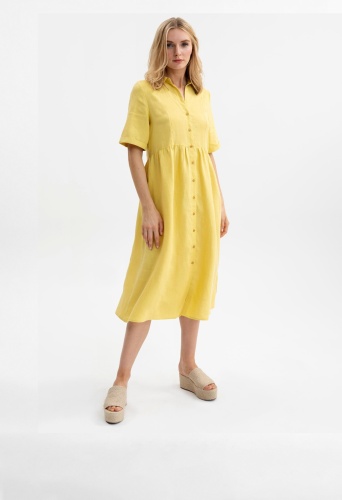Хлопковое платье-рубашка свободного кроя. Длина миди. Отложной рубашечный воротник. Втачной рукав длиной до сгиба локтя. Застежка на пуговицы.