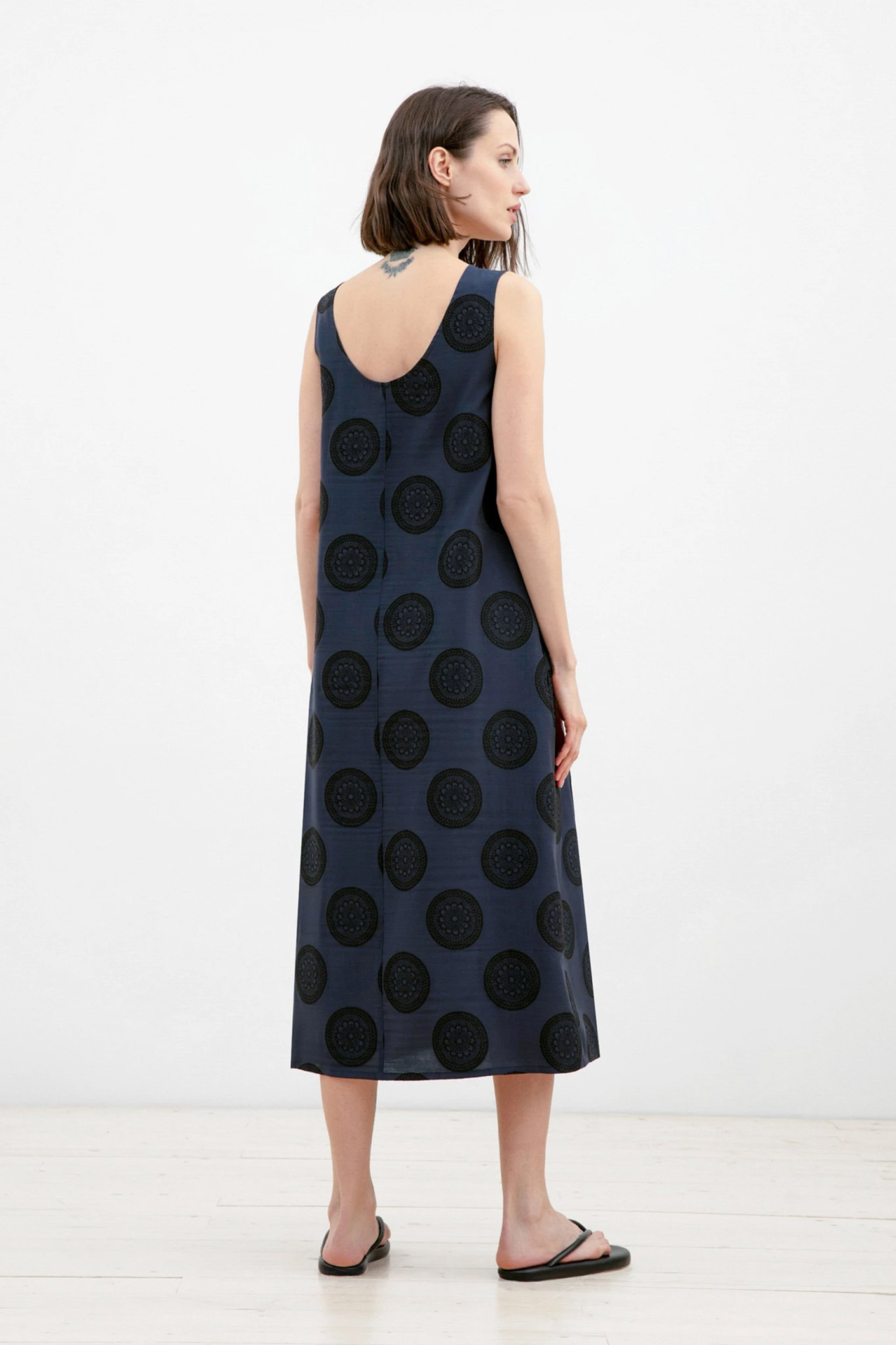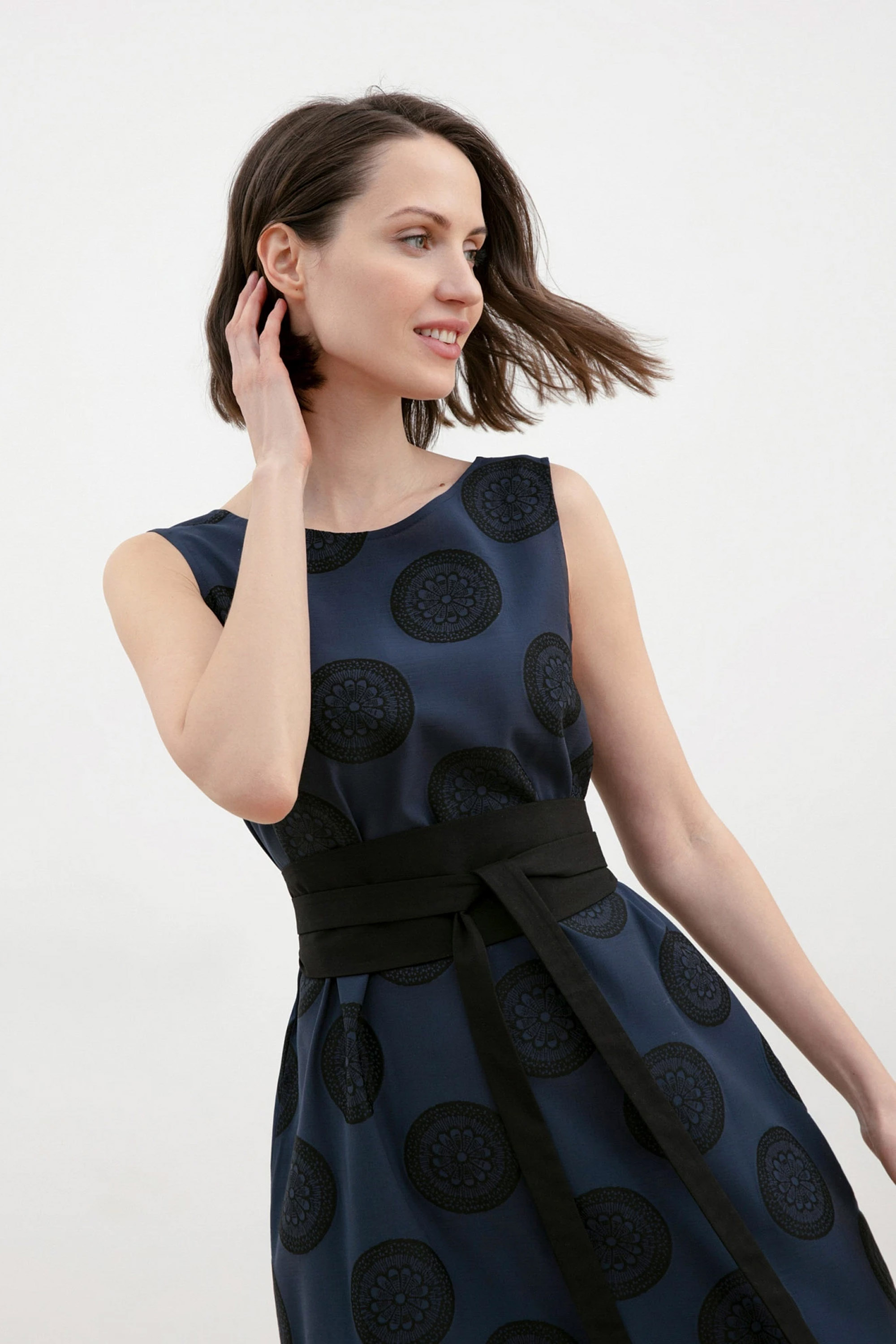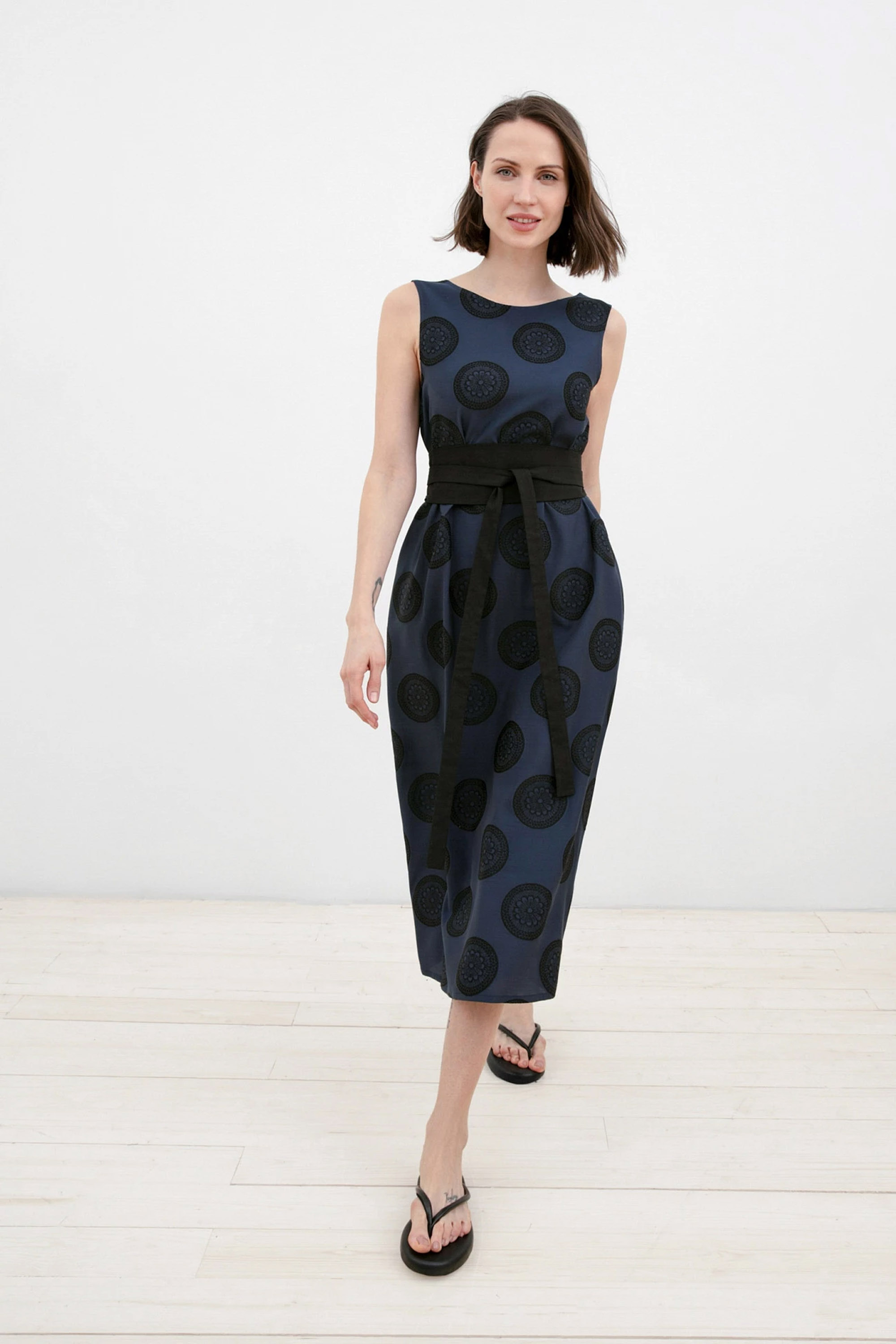 Свободное платье силуэта колокола с круглым вырезом. Пояс кушак в японском стиле подчеркнет талию.