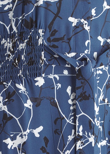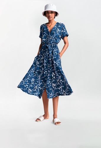 Модное платье миди из струящейся мягкой вискозы. V-образный вырез, короткие рукава и разрез на юбке. На талии присборенная вставка и тканевый пояс.
