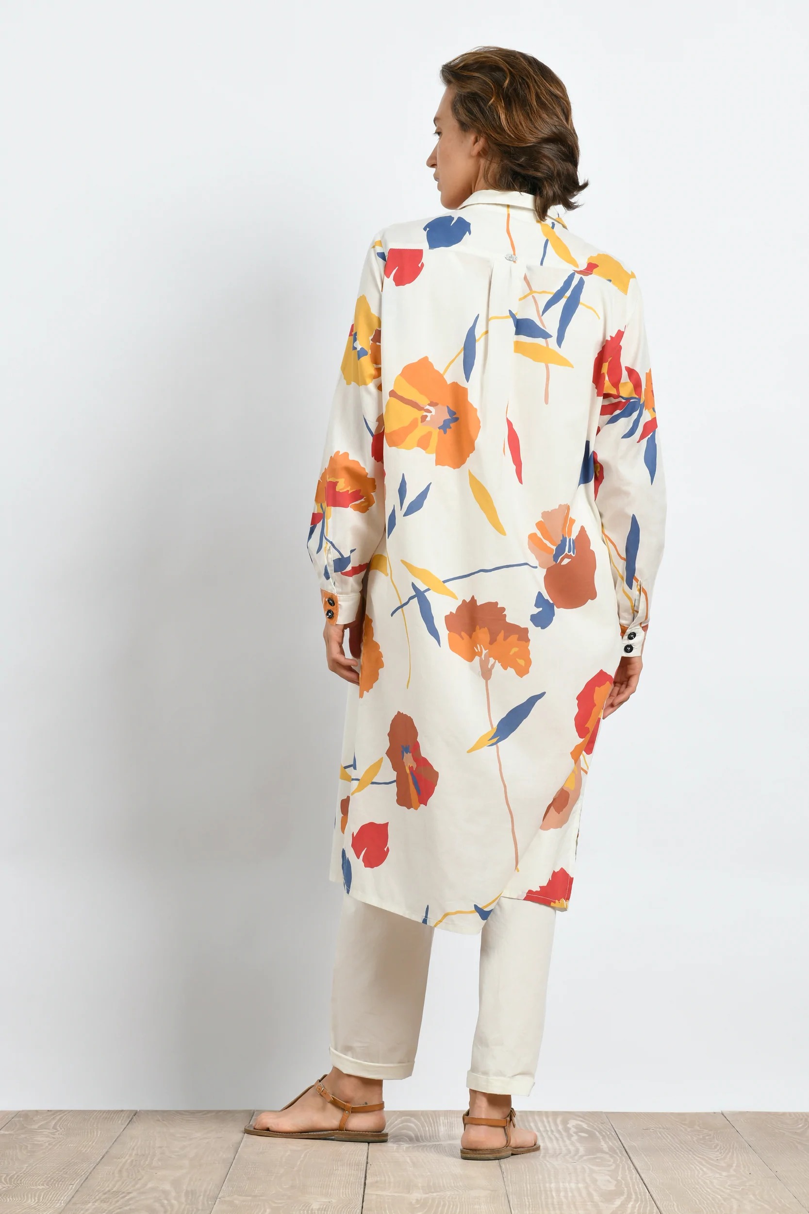 На сайте указаны Российские размеры. Платье-рубашка прямого покроя с рукавами и манжетами на пуговицах. Предлагается со съемным модным ремнем. Застежка на перламутровые пуговицы. 2 внутренних кармана в боковых швах. Складка на спине.