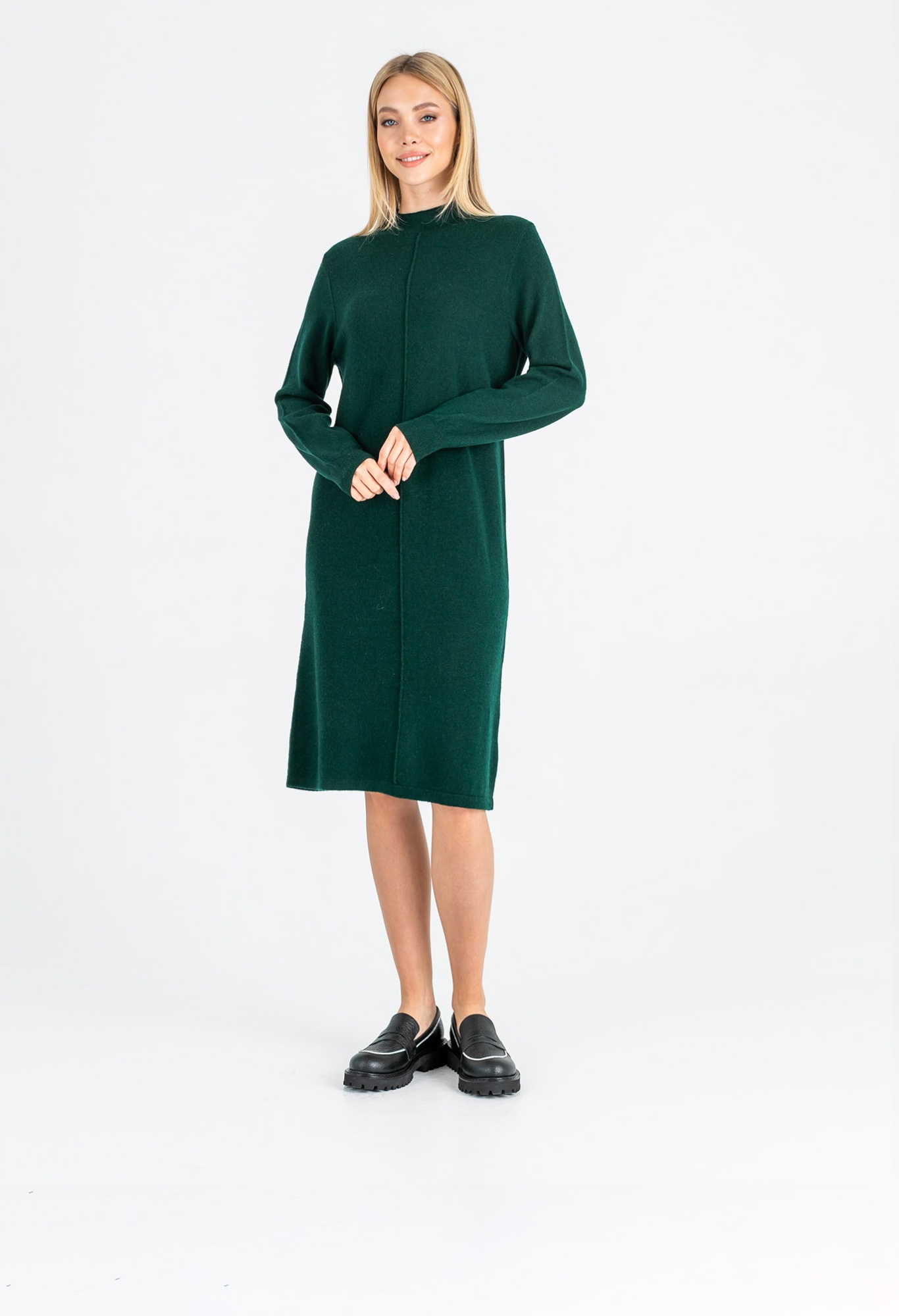 На сайте указаны российские размеры. Крой: теплое платье из плотного трикотажа прямого силуэта с длинным рукавом. Длина рукава регулируется при помощи манжета на резинке. Длина ниже колена, насыщенный изумрудный цвет. Стильная базовая модель с круглым, слегка поднятым вырезом, прикрывающим часть шеи. Идеально сидит на разных фигурах и подчеркивает достоинства. Плотность материала позволяет нивелировать возможные недостатки в области живота, бедер и талии. Отделка: в задней части платья расположен фирменный шильдик, говорящий о вашем прекрасном вкусе. Фактурная полоса в центре платья создает дополнительную вертикаль, которая визуально делает силуэт более стройным и вытянутым. Сочетайте с высокими сапогами-трубами, ботинками на грубой подошве и спортивной обувью. Рост 177 см