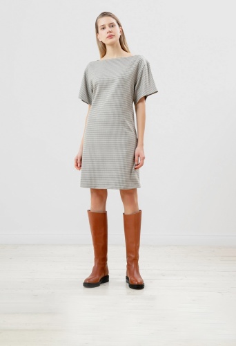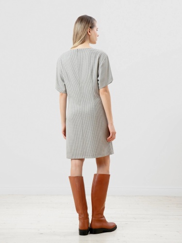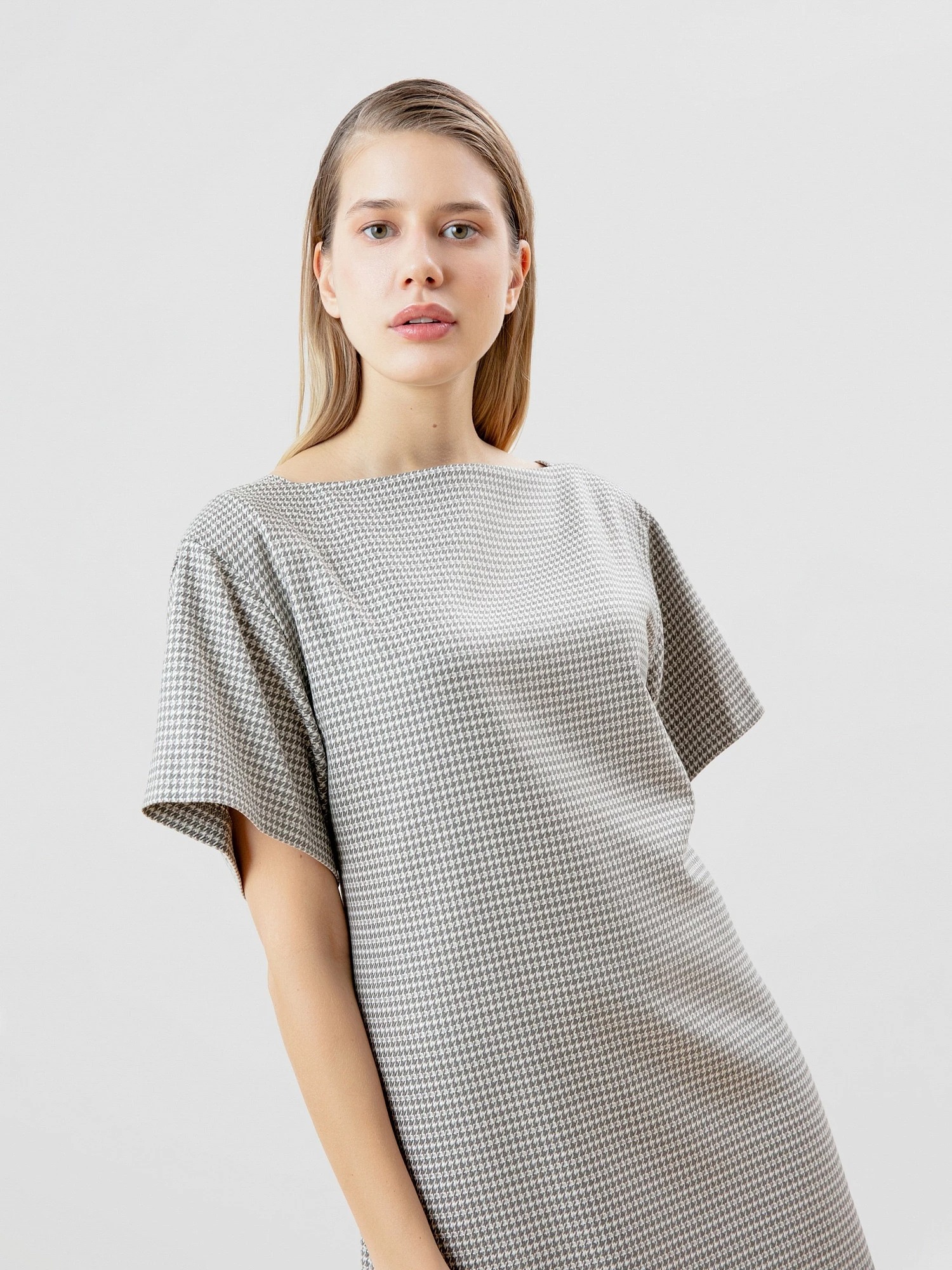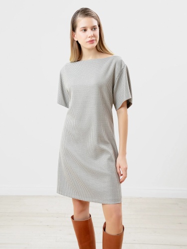 На сайте указаны Российские размеры. Платье из костюмной ткани в принте гусиная лапка, полуприлегающего силуэта с горловиной лодочка и укороченным рукавом кимоно. В боковых швах есть рабочие потайные карманы. Рост модели на фото - 175 см.