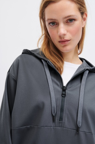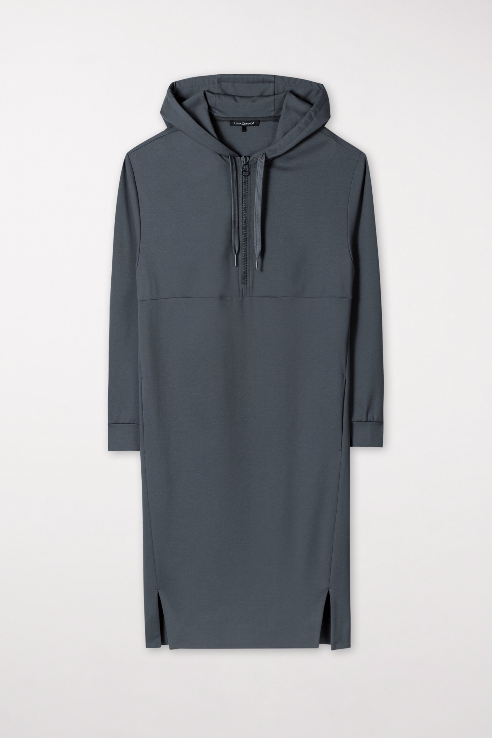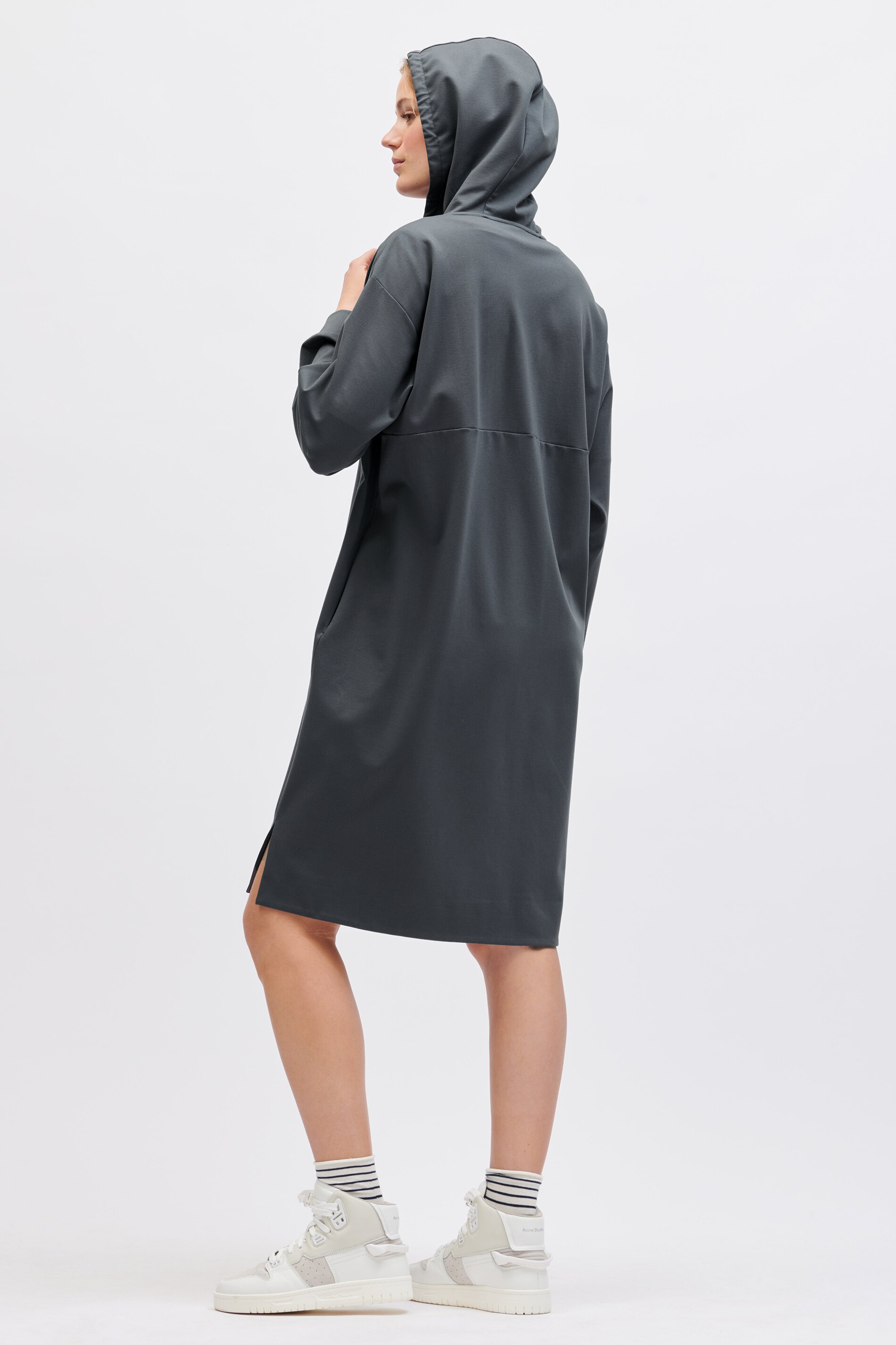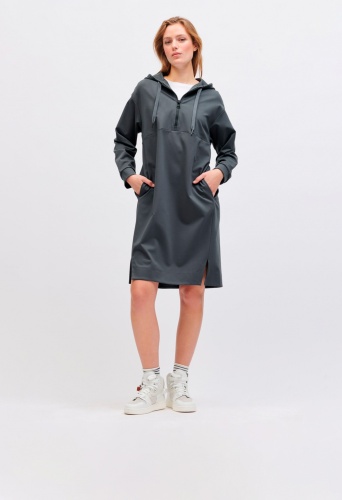 На сайте указаны российские размеры. Платье с капюшоном прямого кроя из смешанной ткани с вискозой. Капюшон на подкладке с кулиской, застежкой на поясную молнию и разрезами по бокам. Модель ростом 178 см