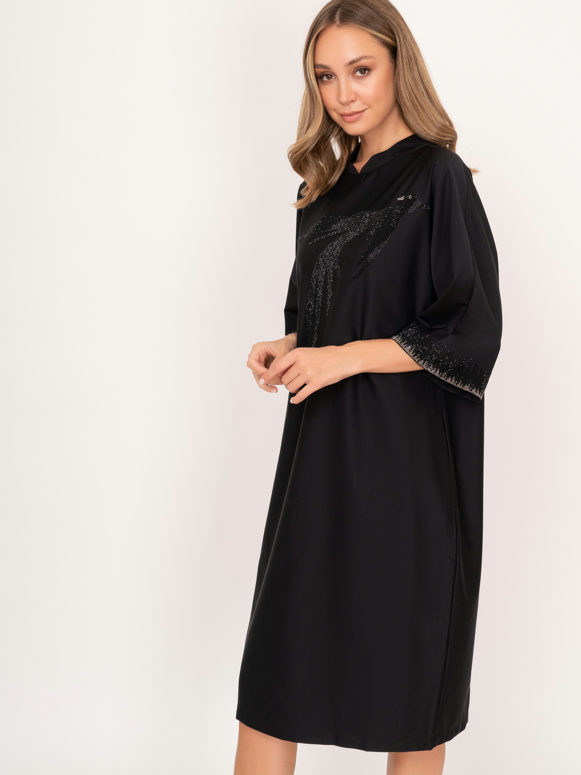 На сайте указаны российские размеры. Прямое черное миди платье с фигурным воротником, с укороченным рукавом 3/4, украшенный стразами. Платье дополняет рисунок птицы из страз. Рост модели: 175 см. Длина платья: 106 см.