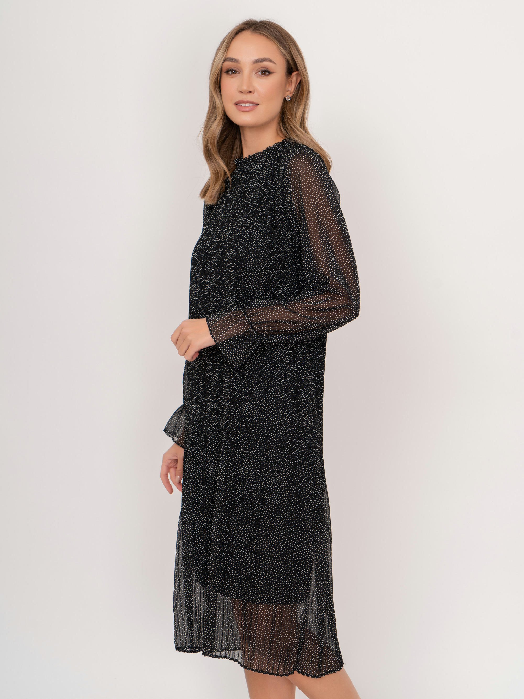 На сайте указаны российские размеры. Полупрозрачное черное миди платье трапеция в белый горох с круглым воротником, с длинным рукавом. Горловина и рукава дополнены воланами. Рост модели: 175 см. Длина платья: 110 см.