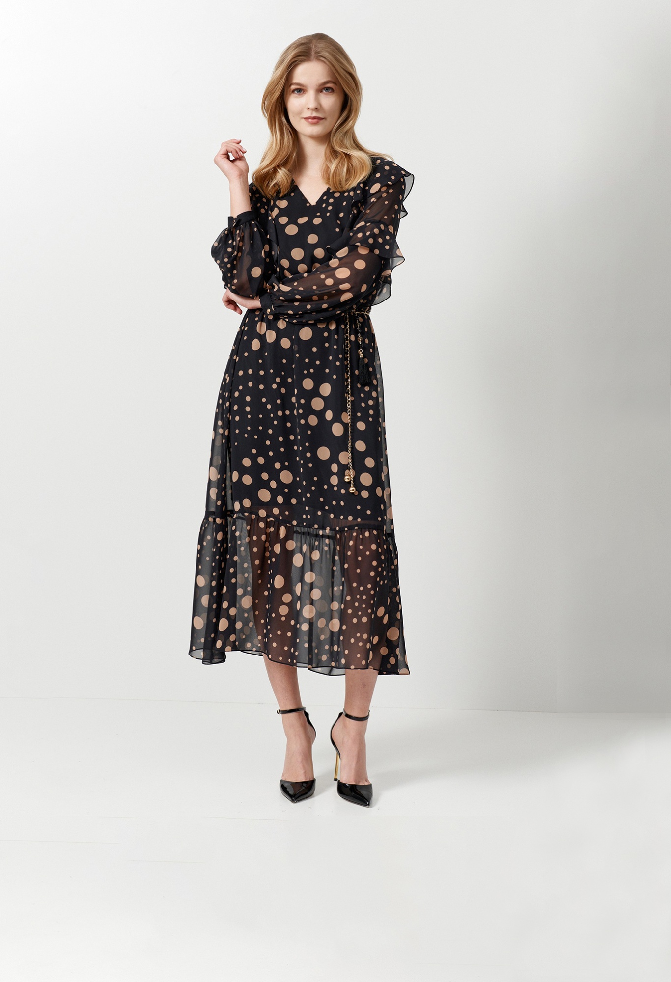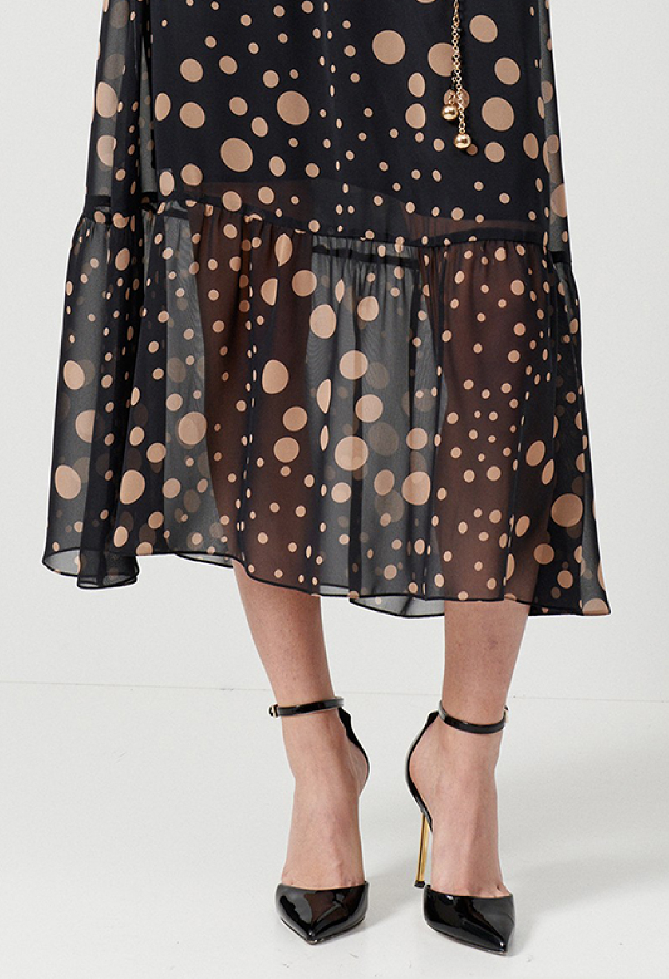 На сайте указаны российские размеры. Оригинальное платье-двойка с принтом. Верхнее полупрозрачное платье с рюшами на длинных рукавах на пуговице.