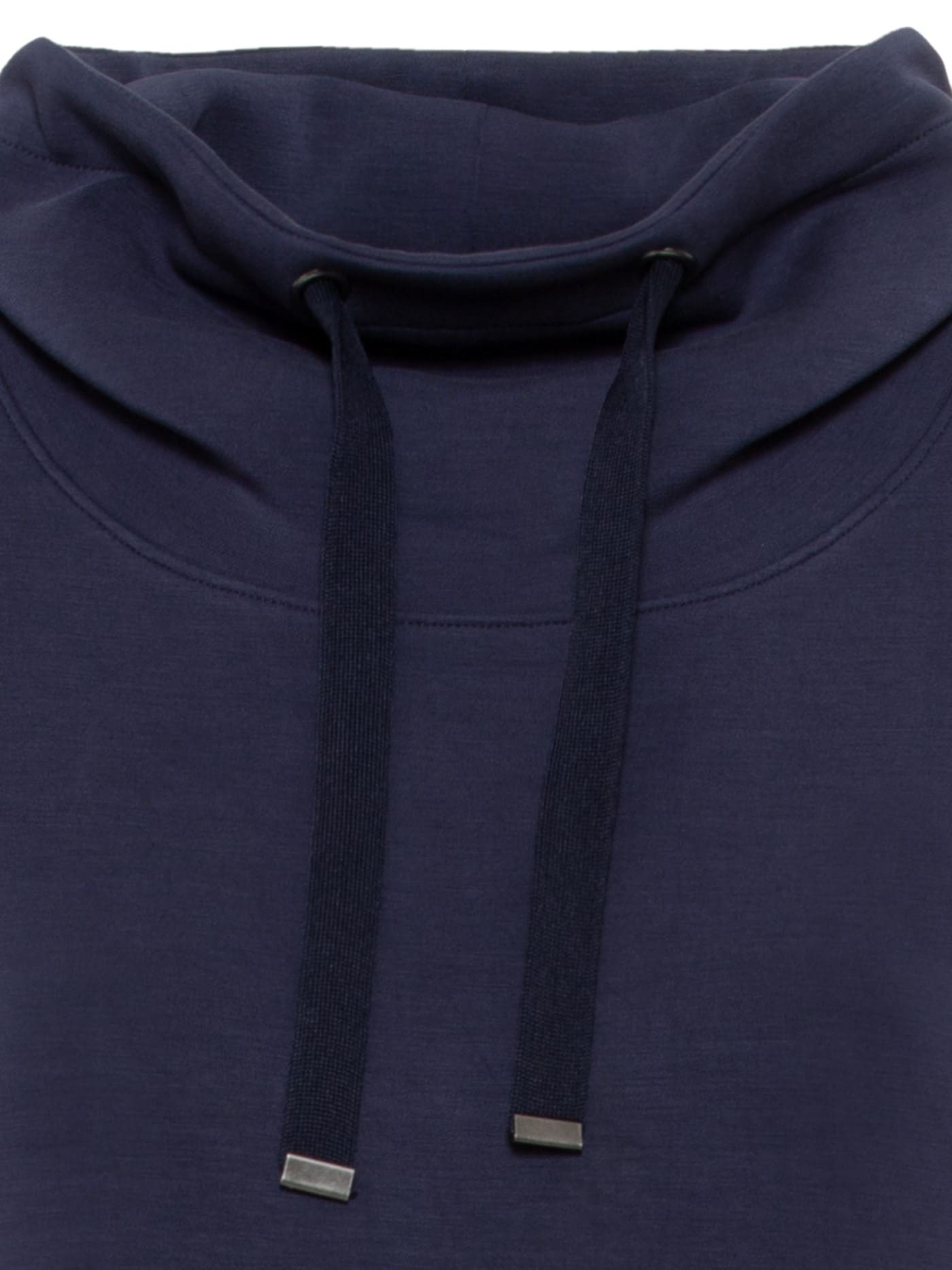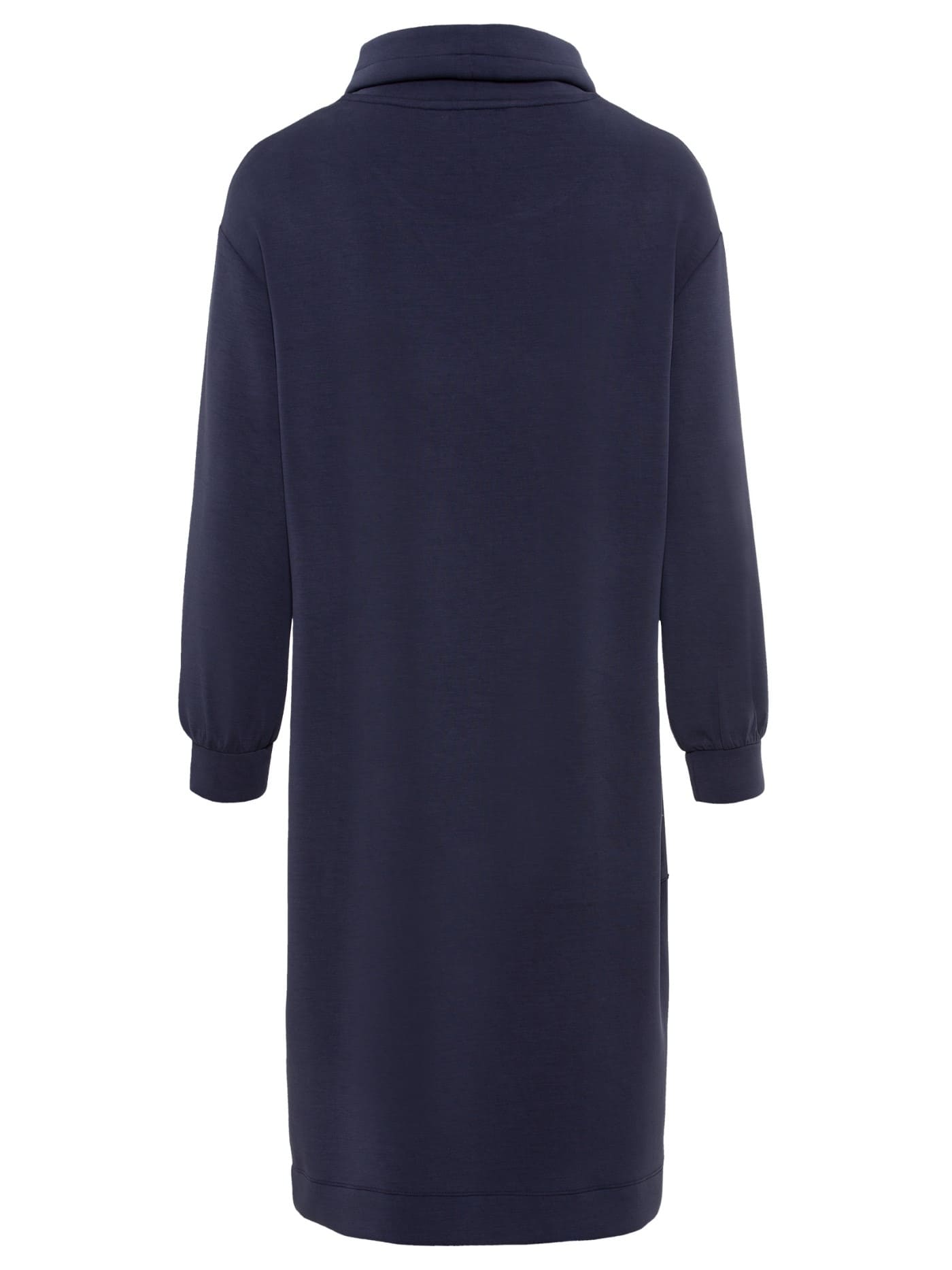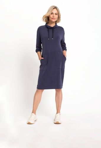 На сайте указаны российские размеры. Прямое спортивное платье со свободным воротником-стойкой на шее. Два передних кармана с акцентной строчкой. Длинные рукава отделаны резинкой. Длина: 100 см в 44 размере.