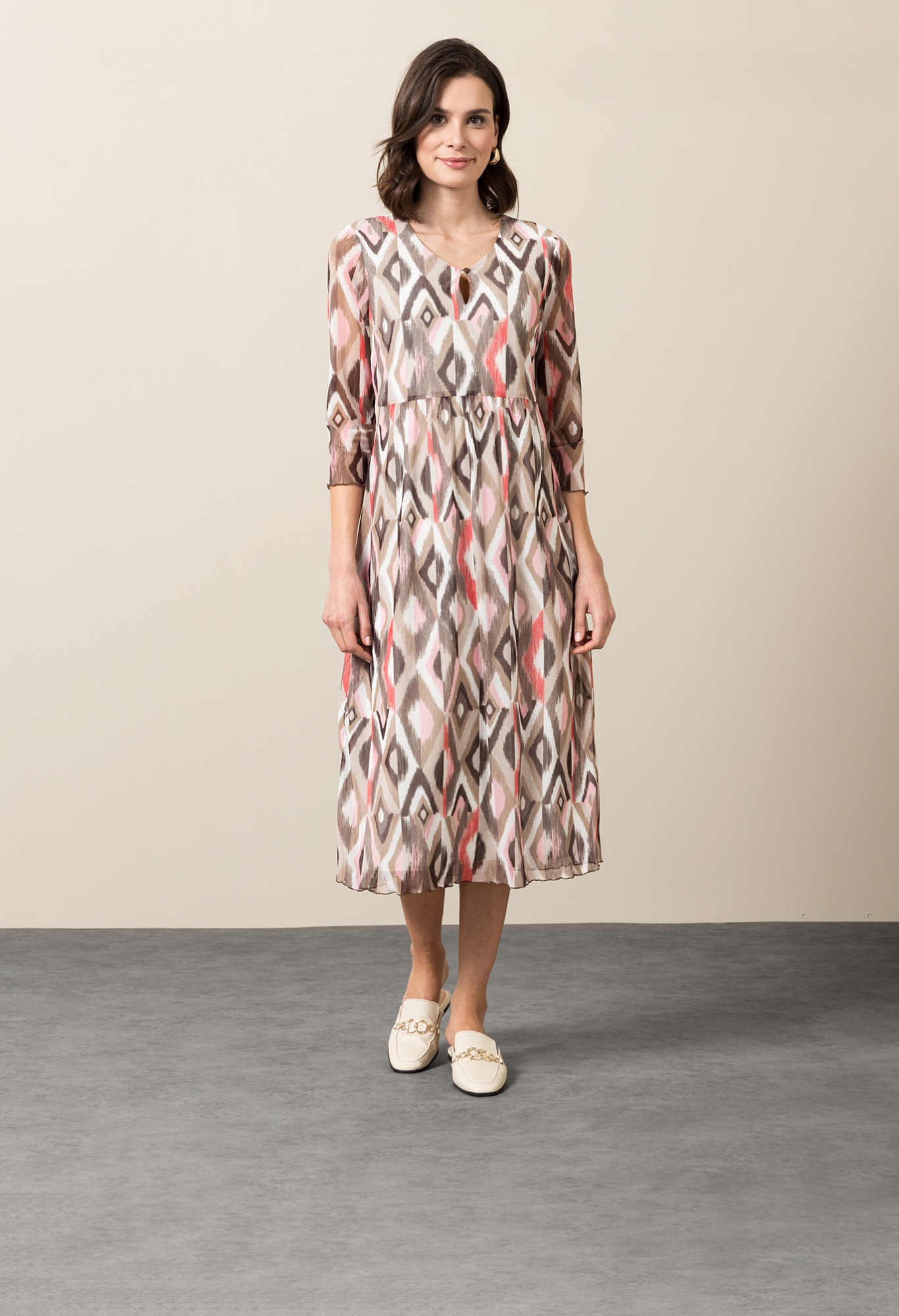 На сайте указаны российские размеры. Платье макси с V-образным вырезом и прозрачными рукавами 3/4. Высококачественный полиэстер с эластаном, подкладка из джерси. Деталь с пуговицами на вырезе. Длина юбки около 78 см, рост нашей модели около 180 см.