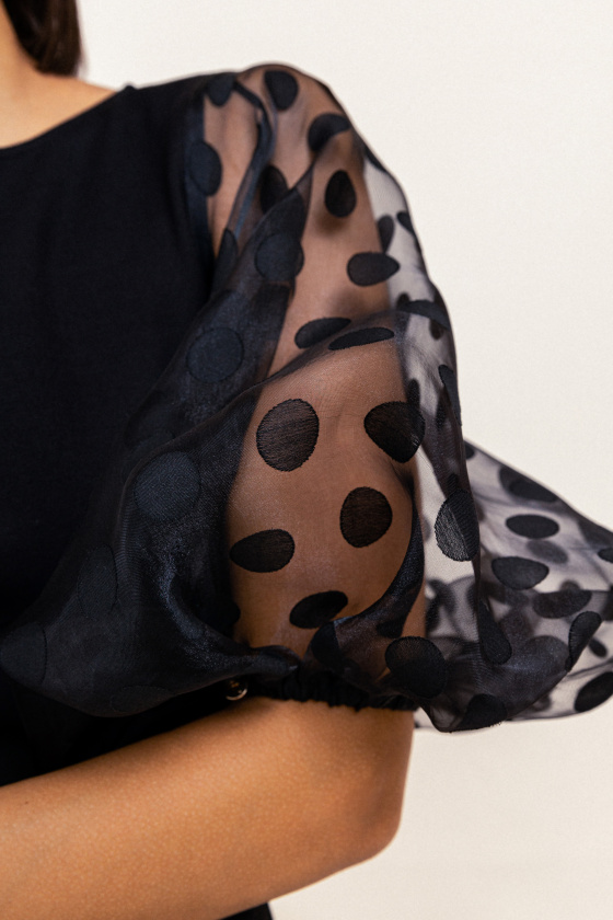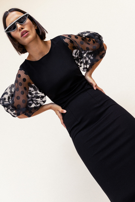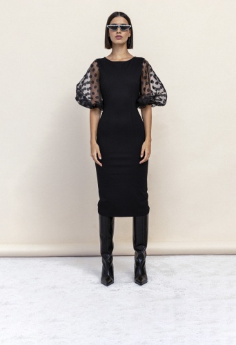 На сайте указаны российские размеры. Облегающее платье со вставками из органзы. Длина миди. Объемный рукав выше локтя из органзы. Застежка-молния. Рост модели 173 см.