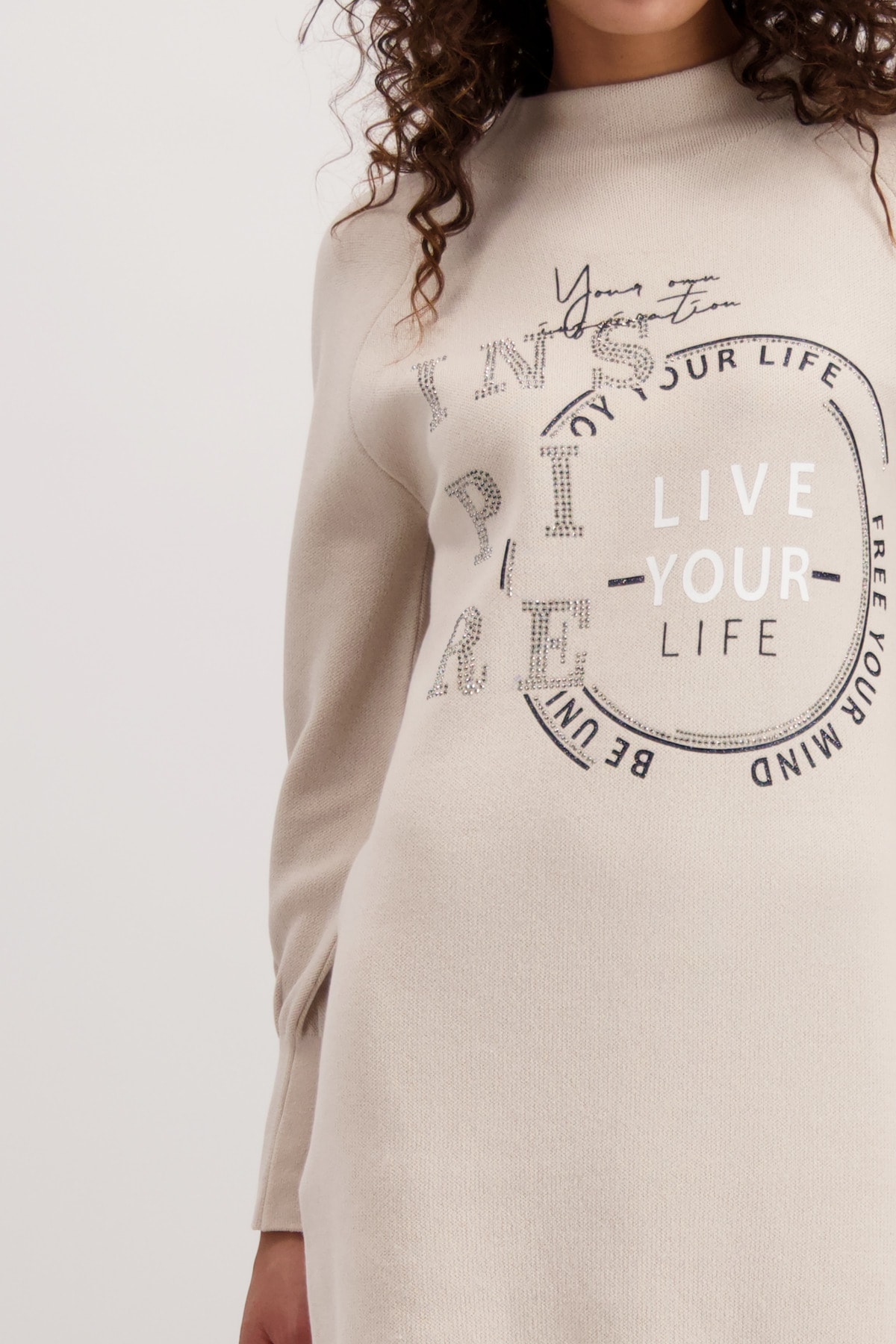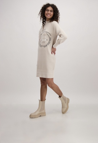 На сайте указаны российские размеры. Длинный прямой крой этого платья миди от monari идеально подчеркивает вашу фигуру. Платье с длинными рукавами реглан, вязаным воротником-стойкой и широкими манжетами с рюшами на концах рукавов можно носить и в прохладные дни. Модель комфортно лежит на коже благодаря обработке 100% чистого, качественного хлопка. Передняя часть украшена буквенной эмблемой из глиттера, стразов и лакового принта, а также сверкающей надписью из страз и небольшой блестящей объемной надписью. Всегда хороший выбор для вашего наряда! Модель ростом 176 см. Длина спины 44 размера составляет 94 см.