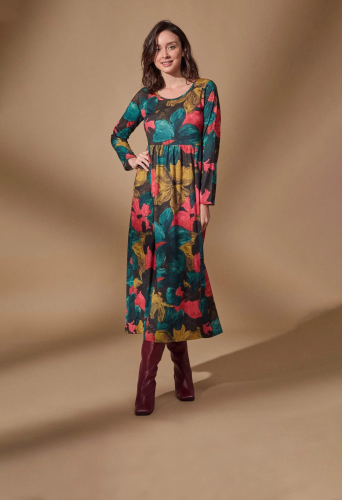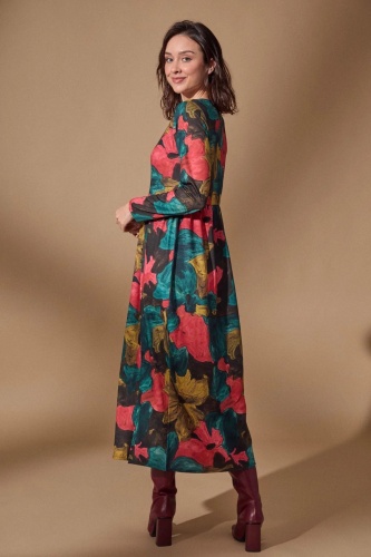 На сайте указаны российские размеры. Длинное платье с цветочным принтом и пышным и объемным низом. Ненавязчивый разрез спереди. Классические длинные рукава и широкий вырез воротника. Рост модели 170 см. Длина 124 см в размере 44.