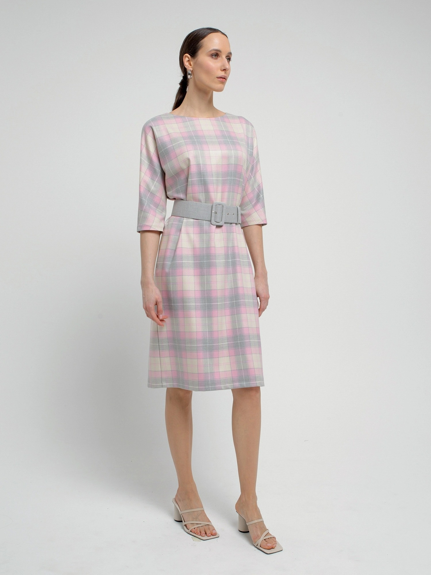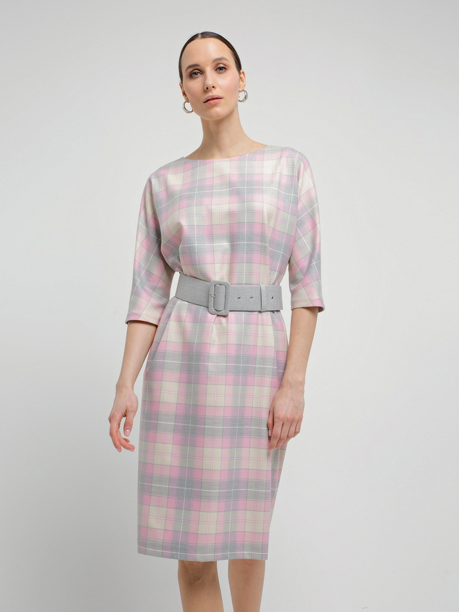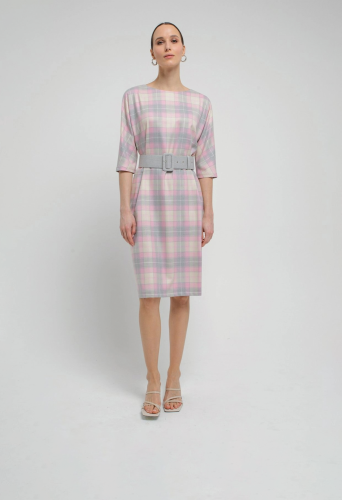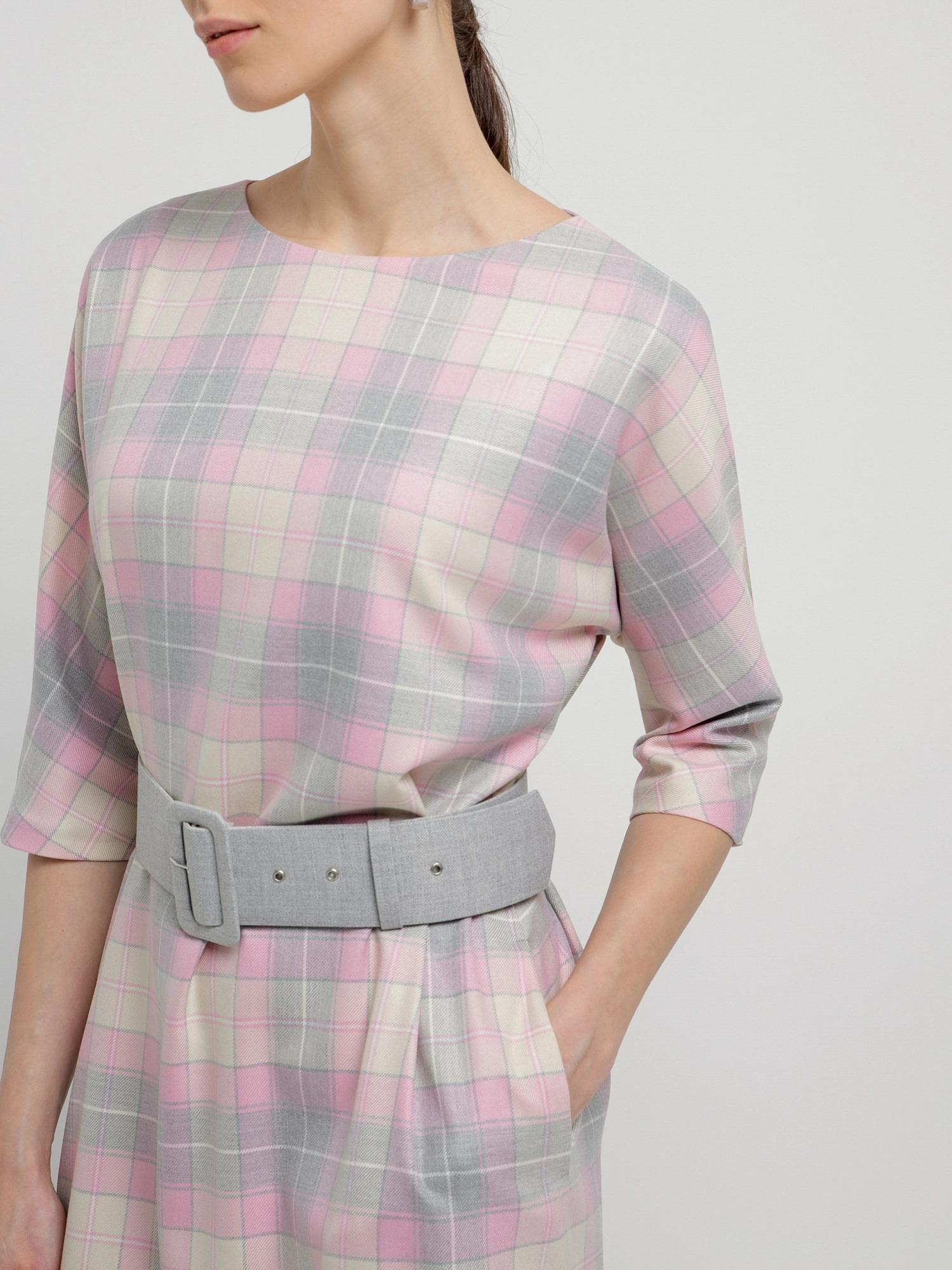 На сайте указаны российские размеры. Платье из костюмной ткани в серо-розовую клетку, полуприлегающего силуэта без застежки с горловиной лодочка и укороченным цельнокроеным рукавом. Обтяжной пояс фиксирует талию и добавляет мягкие складки. Есть потайные карманы в швах.. Рост модели 175 см.