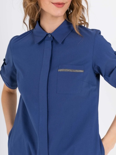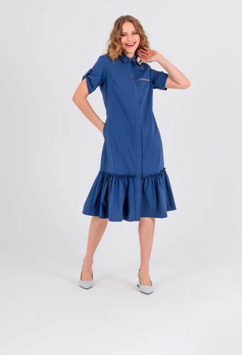 На сайте указаны российские размеры. Платье-рубашка А-силуэта длиной midi с оборкой по низу. Перед с двумя вытачками на выпуклость груди, идущими из боковых швов. Застежка потайная на 10 пуговиц. Также в области груди располагается накладной карман с декоративной аппликацией из страз. Укороченные рукава с патами на пуговицах. Стояче-отложной воротник.