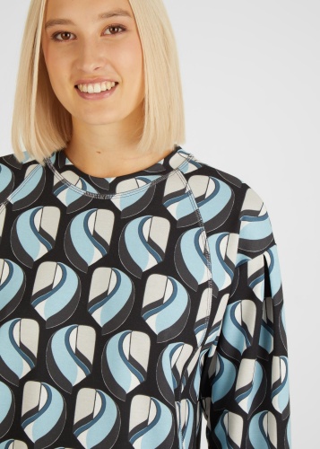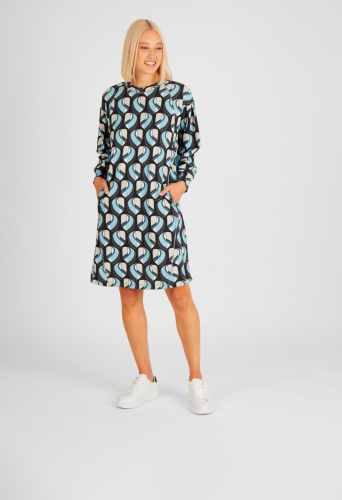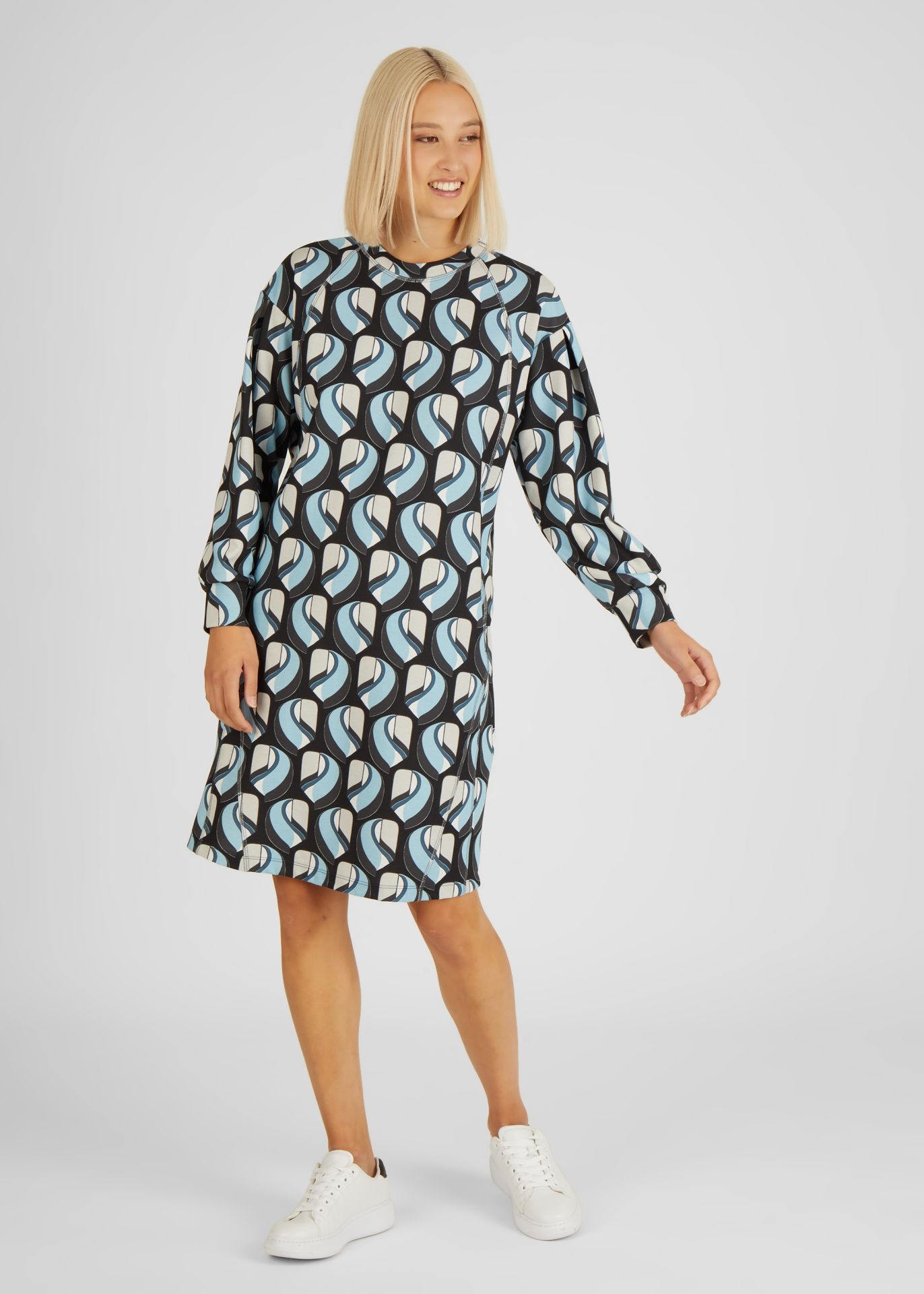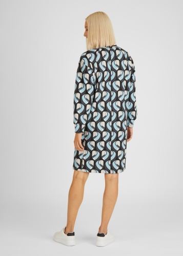 На сайте указаны российские размеры. Трикотажное платье с длинными рукавами и геометрическим рисунком имеет спортивный вид. Декоративные швы по бокам, практичные карманы и эластичные манжеты на рукавах подчеркивают спортивный вид. Мягкое качество смеси джерси и хлопка и прямой крой делают это платье незаменимым фаворитом. Рост модели 176 см. Длина по спинке от плеча для размера 44: 98 см