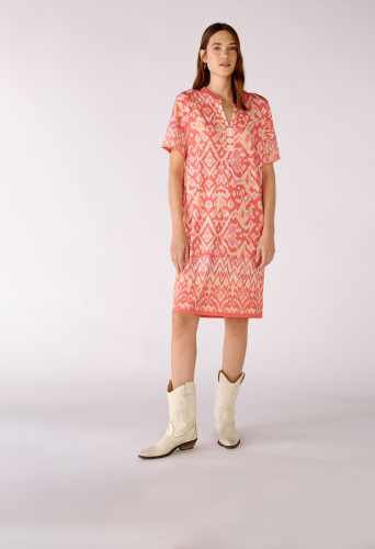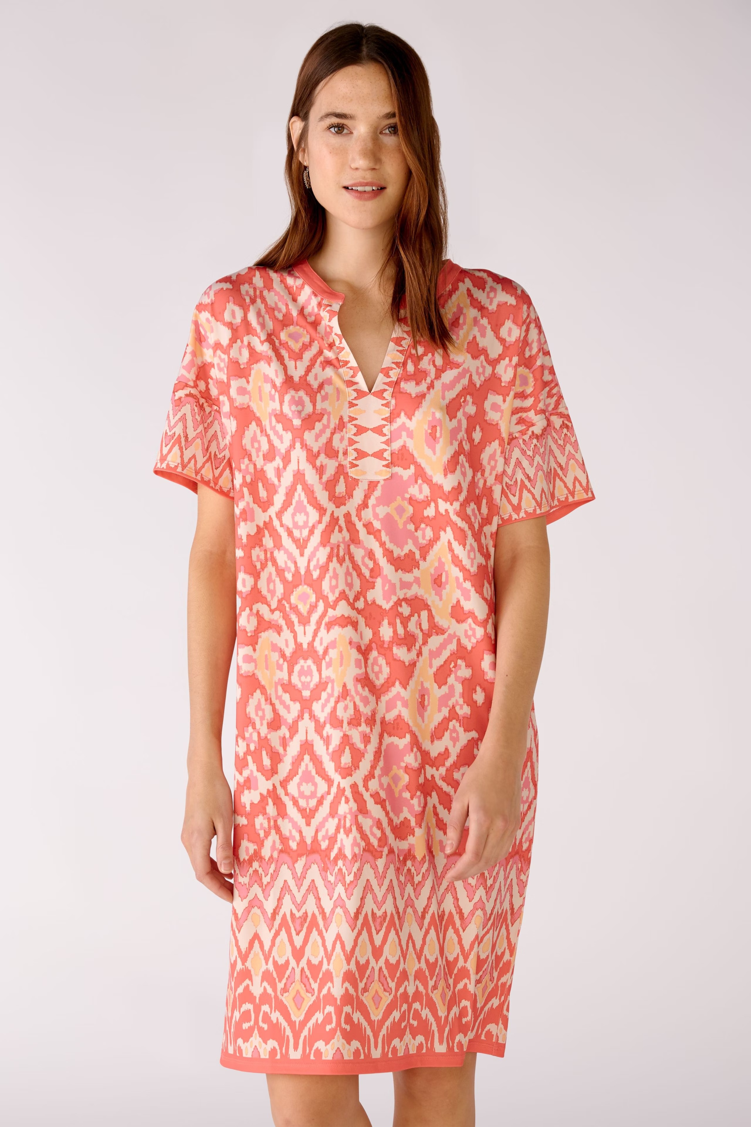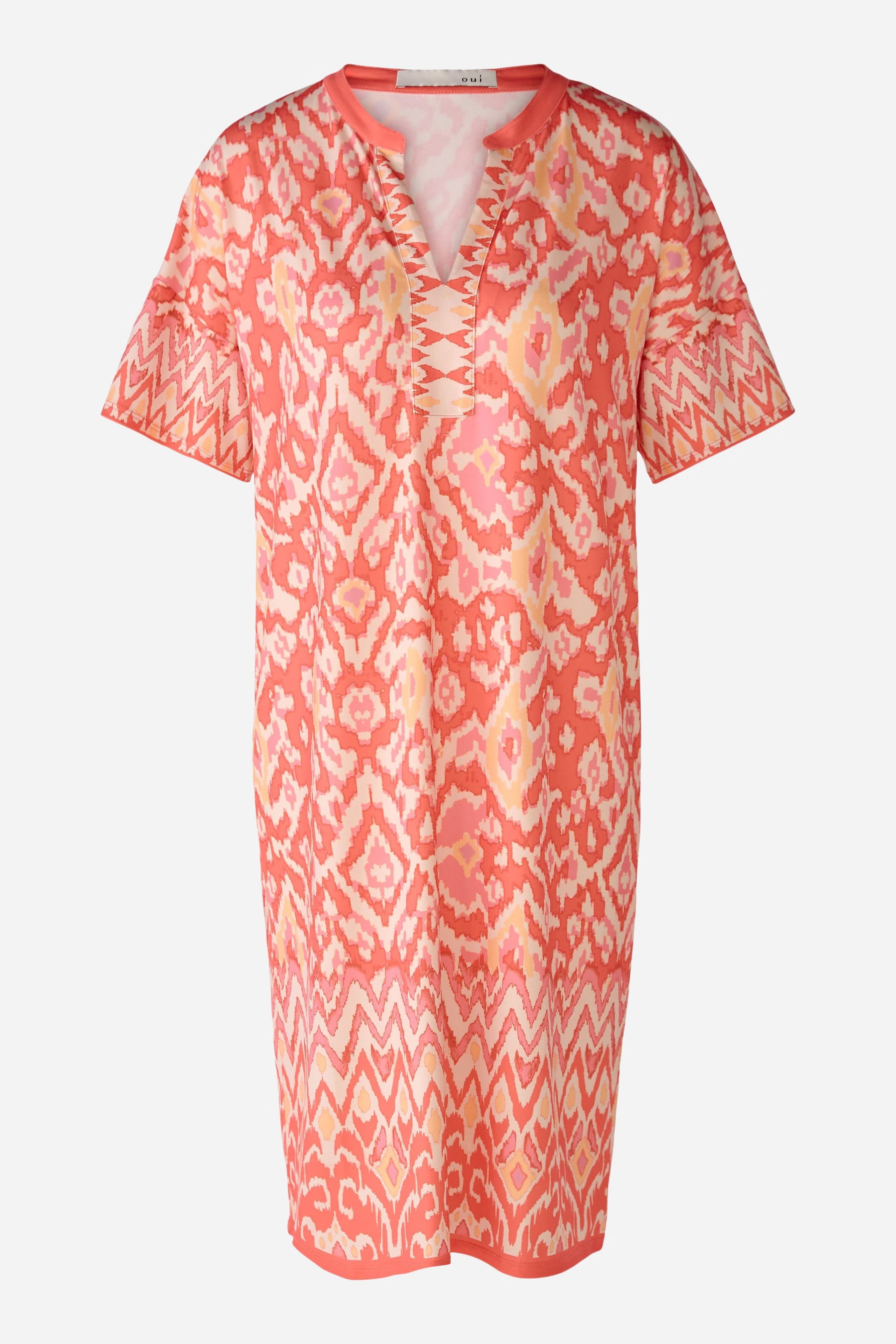 На сайте указаны российские размеры. Красочной платье OUI без складок из немнущаяся ткани Silky Touch с принтом по всей поверхности. Прямой крой, длина до колена. Красивый вырез на тунике. Укороченный рукав до половины. Длина в размере 42: 94 см. Рост модели 177 см.