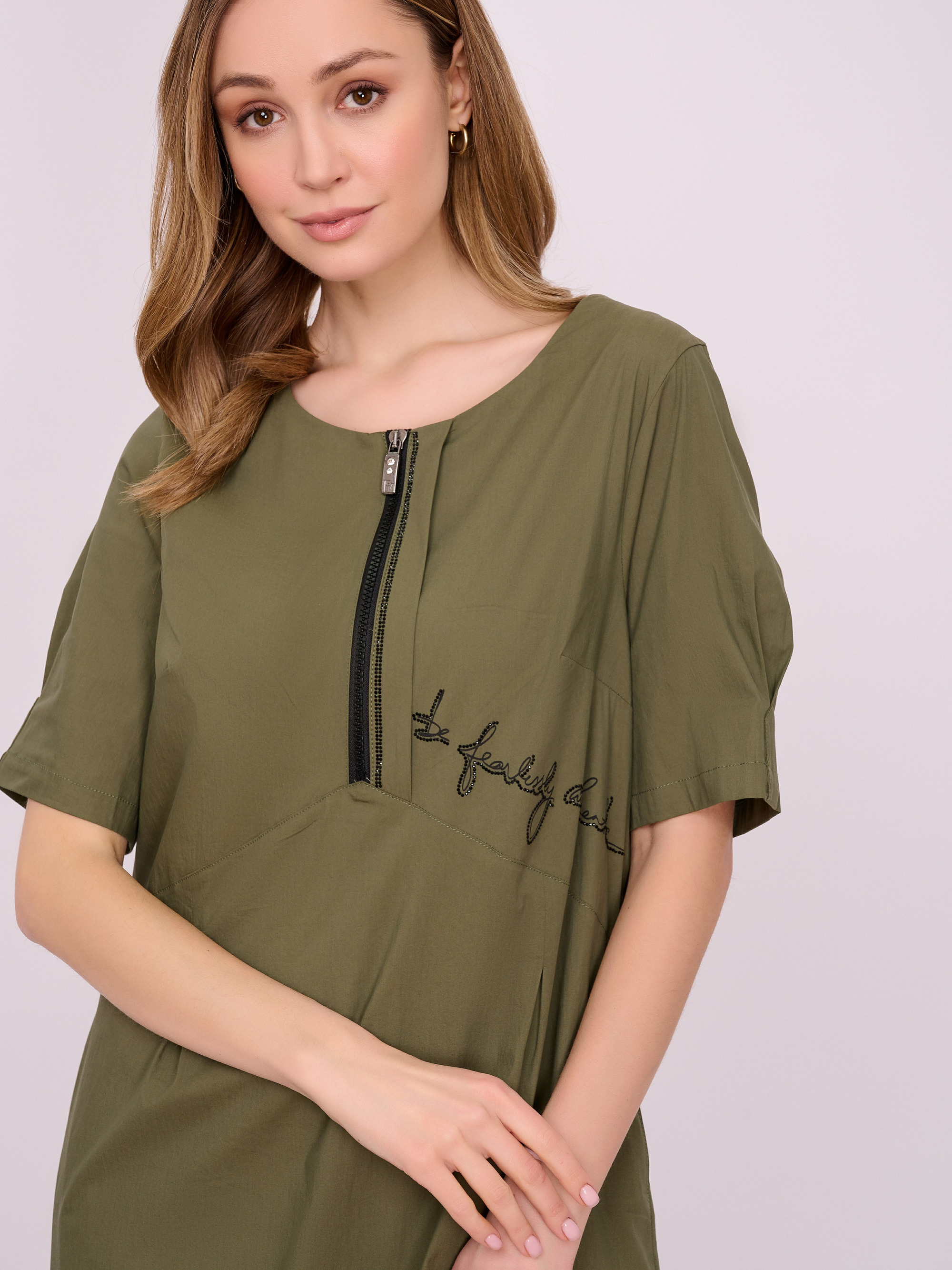 На сайте указаны российские размеры. Платье средней длины на молнии с округлой горловиной, короткими рукавами, кокеткой и юбкой «тюльпан». Украшено надписью со стразами. Длина по спинке: 110 см. Рост модели 175 см.