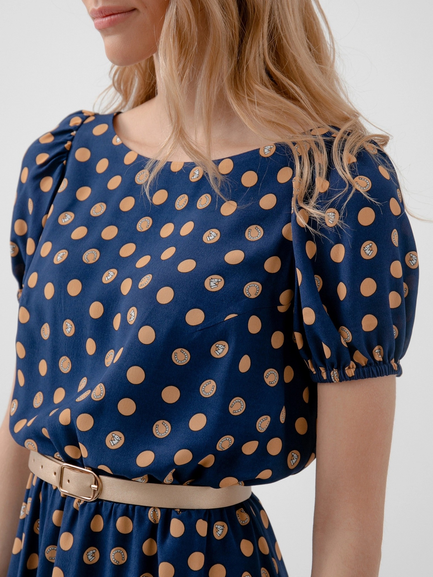 Приталенное платье из вискозной ткани с принтом с юбкой полусолнце. Платье с небольшим втачным рукавом на резинке и круглой горловиной. В комплект входит тонкий пояс из экокожи цвета охры.