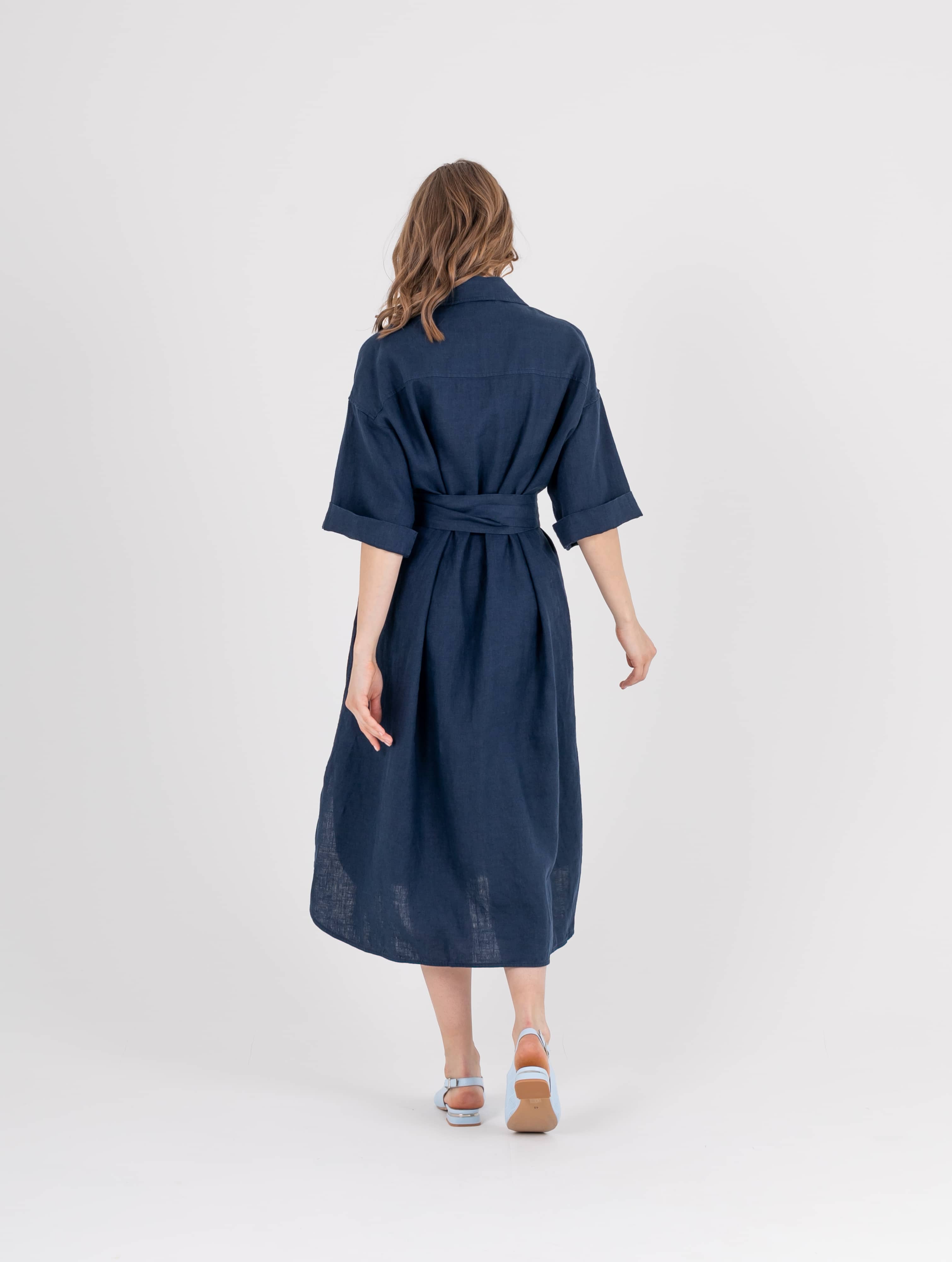 Платье-рубашка прямого силуэта длиной midi из натурального льна с потайной застежкой на 10 прорезных петель и пуговиц, с разрезами в боковых швах и съемным поясом. На спинке прямая кокетка. Укороченные цельнокроеные рукава со спущенной линией плеча. Стояче-отложной воротник.