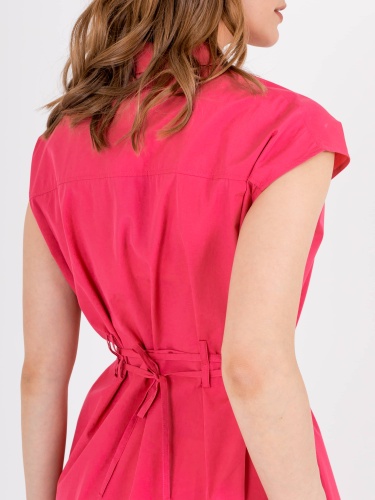 Яркое платье полуприлегающего силуэта длиной выше колен из легкого 100% хлопка со съемным поясом и карманами в боковых швах. На спинке прямая кокетка и двойные шлевки для более плотного прилегания. Короткие цельнокроеные рукава. Стояче-отложной воротник с декоративной планкой на 6 прорезных петель и пуговиц.
