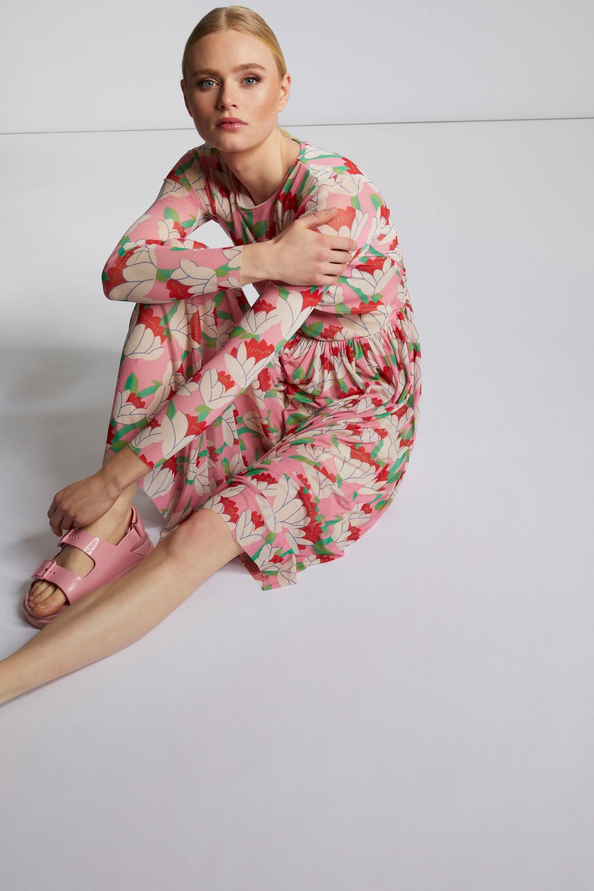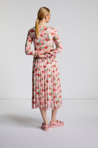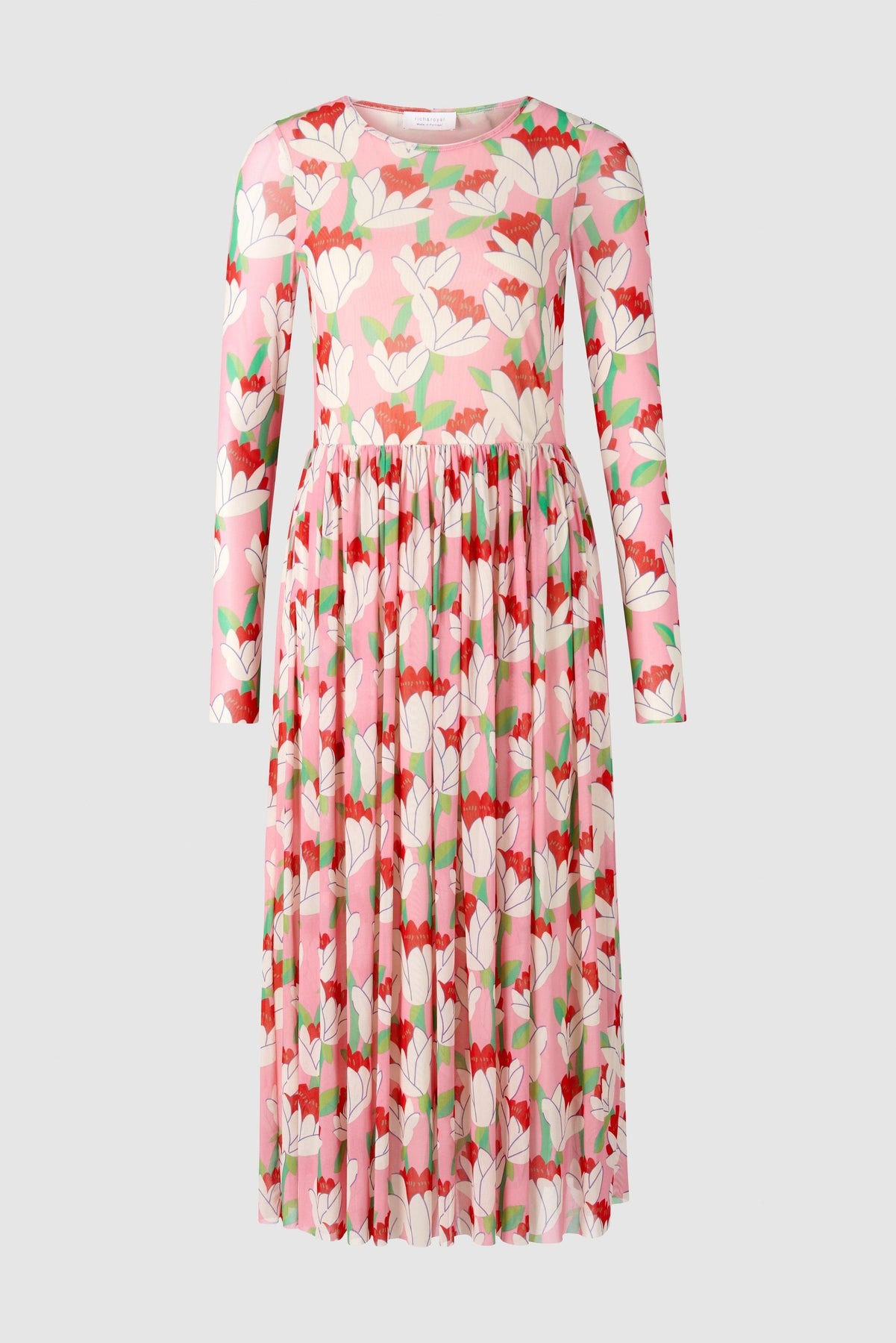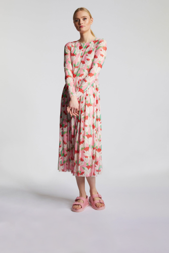 Игривый цветочный принт по всей поверхности придает этому сетчатому платью особую легкость. Открытые края и круглый вырез придают спортивный вид. Платье облегающее в верхней части и дополнено широкой юбкой макси-длины. Длина в размере 42: 124 см.