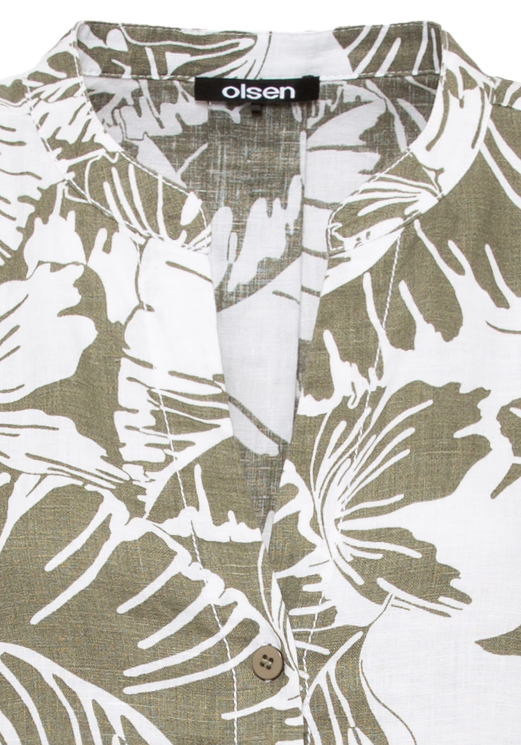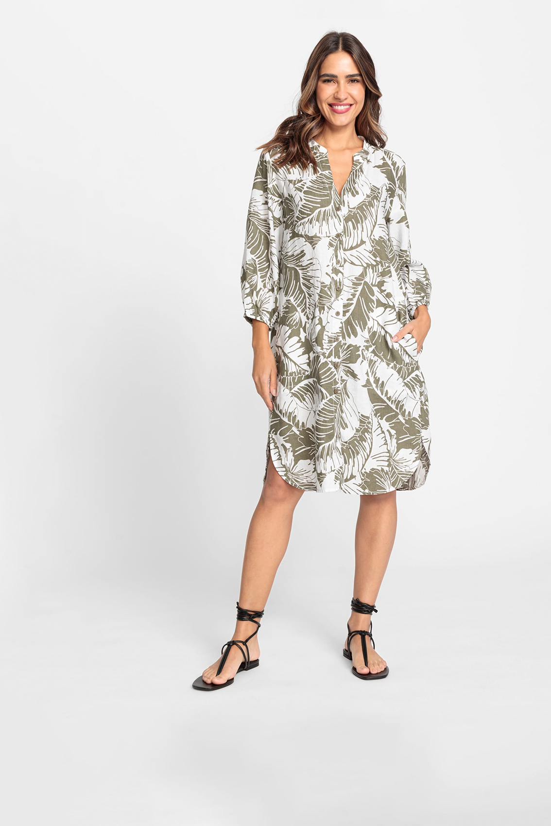 Платье с тропическим садовым принтом. Застежка на пуговицах позволяет носить его закрытым как платье или расстегнутым как удлиненный плащ или пляжную накидку. Закругленная кромка и потайные боковые карманы изготовлены из 100 % льна, обеспечивающего воздухопроницаемость и комфорт.