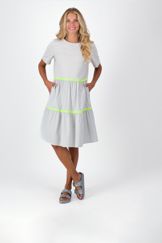 Современное платье миди с круглой горловиной и короткими рукавами. Эластичный трикотаж в верхней части тела обеспечивает комфорт, особенно красиво ложатся воланы из хлопкового материала. Ленты контрастного цвета на отдельных уровнях подзора придают изюминку. Прорезные карманы и повседневный принт на шее искусно завершают образ.