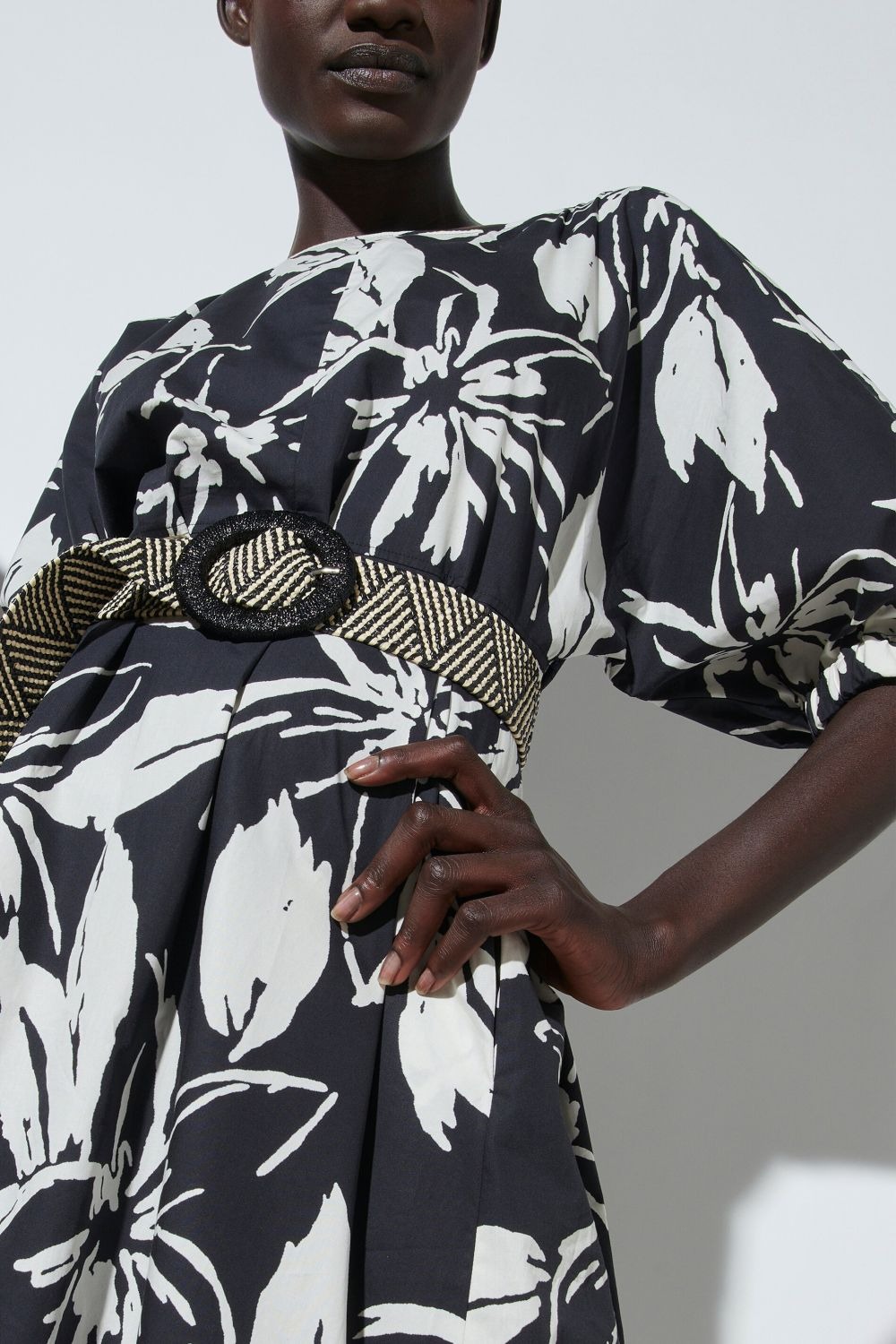Платье средней длины из хлопкового поплина с эксклюзивным рисунком в виде цветов гибискуса и двумя карманами. Слегка расклешенный фасон юбки подчеркивается завязывающимся на талии поясом. Рукава-крылышки имеют более широкий дизайн и отделаны эластичной окантовкой.