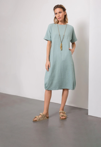 На сайте указаны российские размеры. Лаконичное и комфортное платье свободного О-образного силуэта. Выполнено из смесового хлопка с неординарной «мятой» фактурой. По низу регулируется кулиской. В рельефах бочков удобные карманы. На спинке застежка – свободно завязывающийся шнурок.