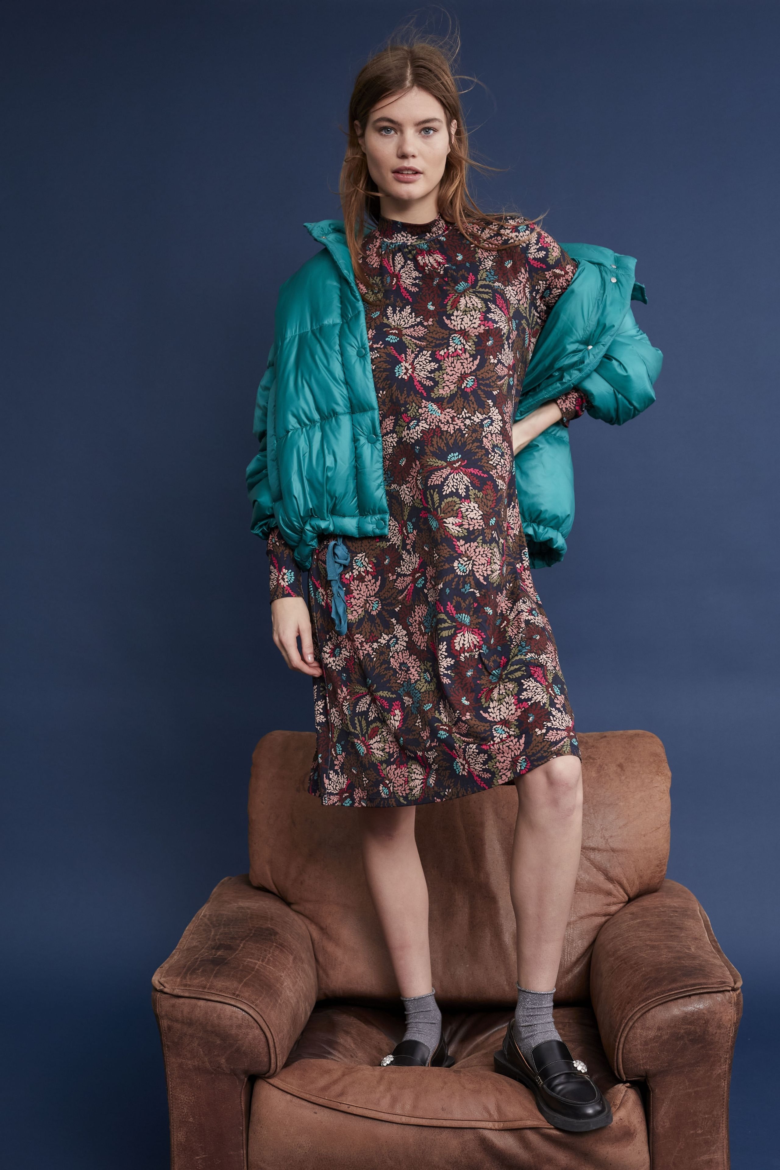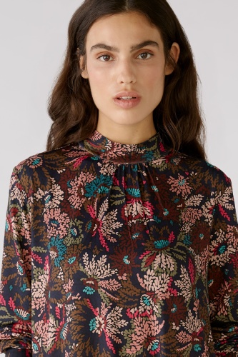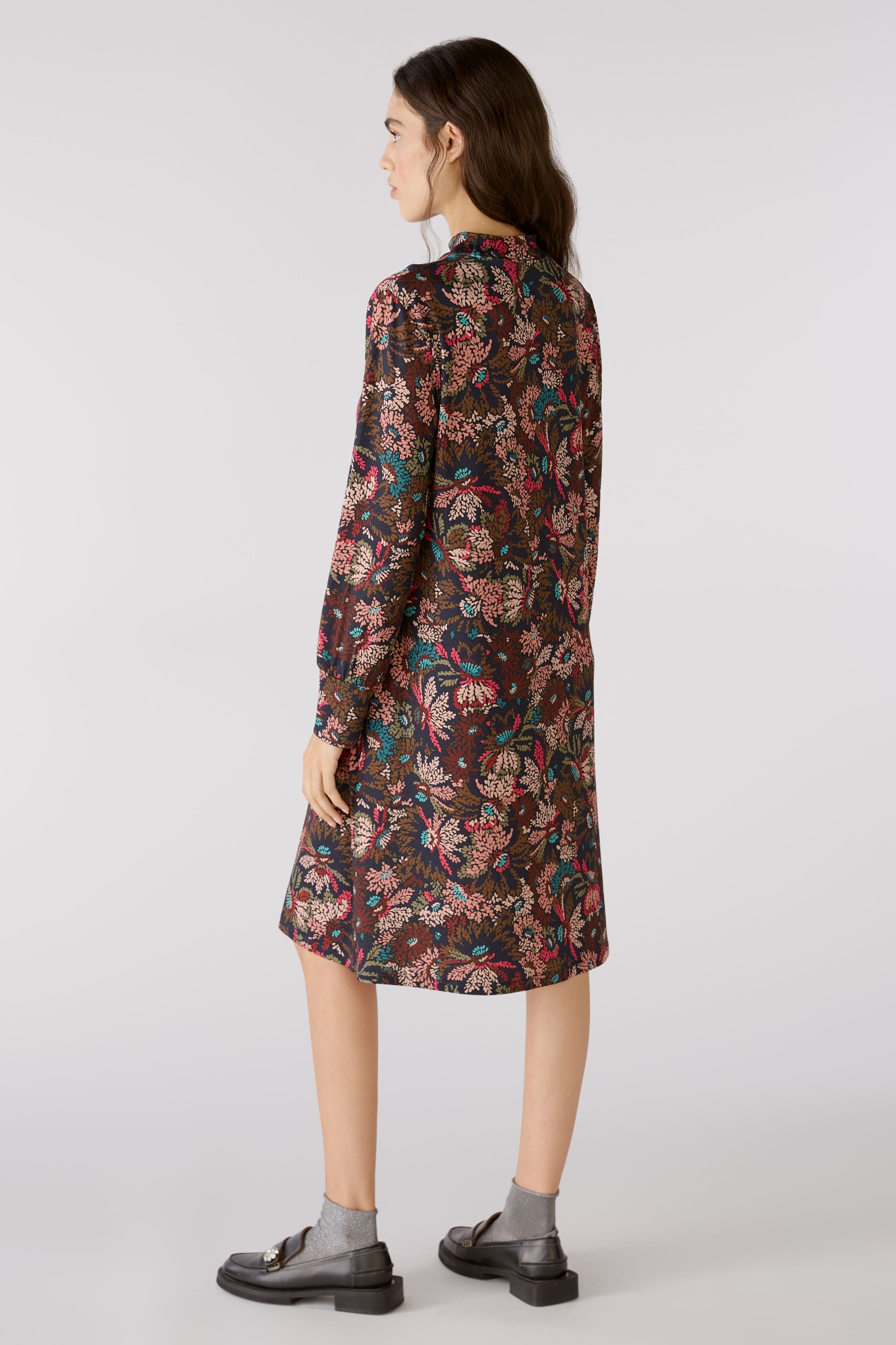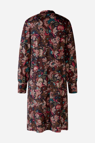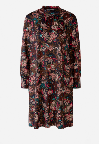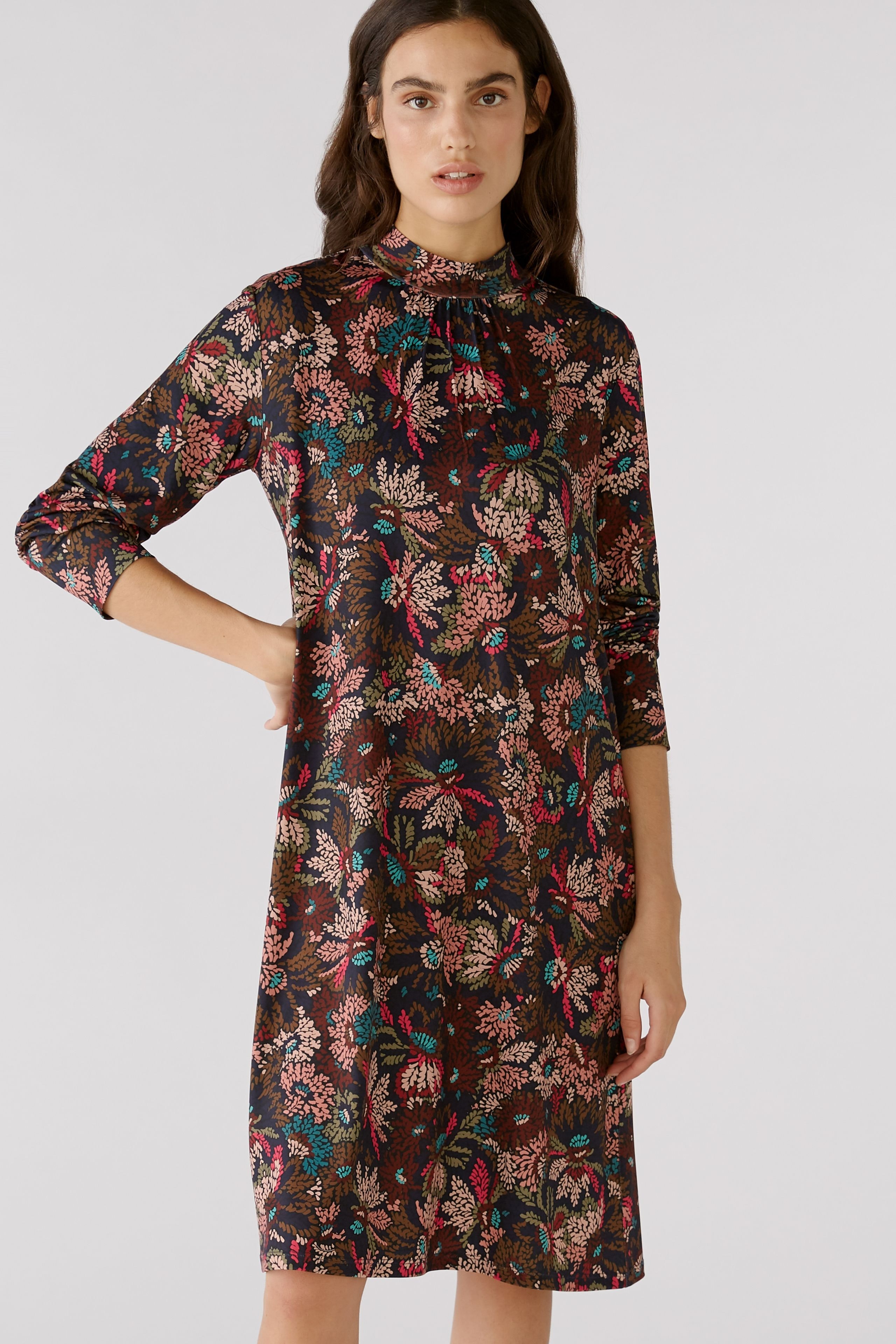 Свободное платье из материала SILKY TOUCH. Очень эластичный, струящийся материал Silky Touch с принтом по всей поверхности. Прямой крой, до колена. Без подкладки, с воротником стойкой. Боковые карманы Длинные рукава с эластичными манжетами. Длина для размера 42: 100 см.