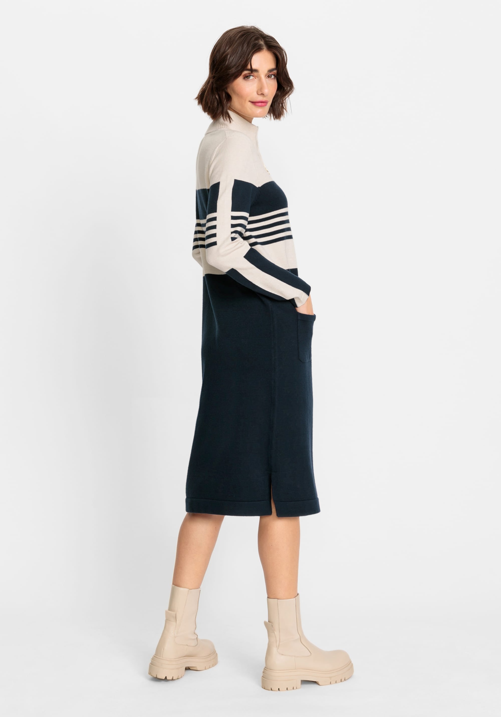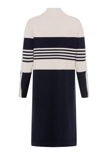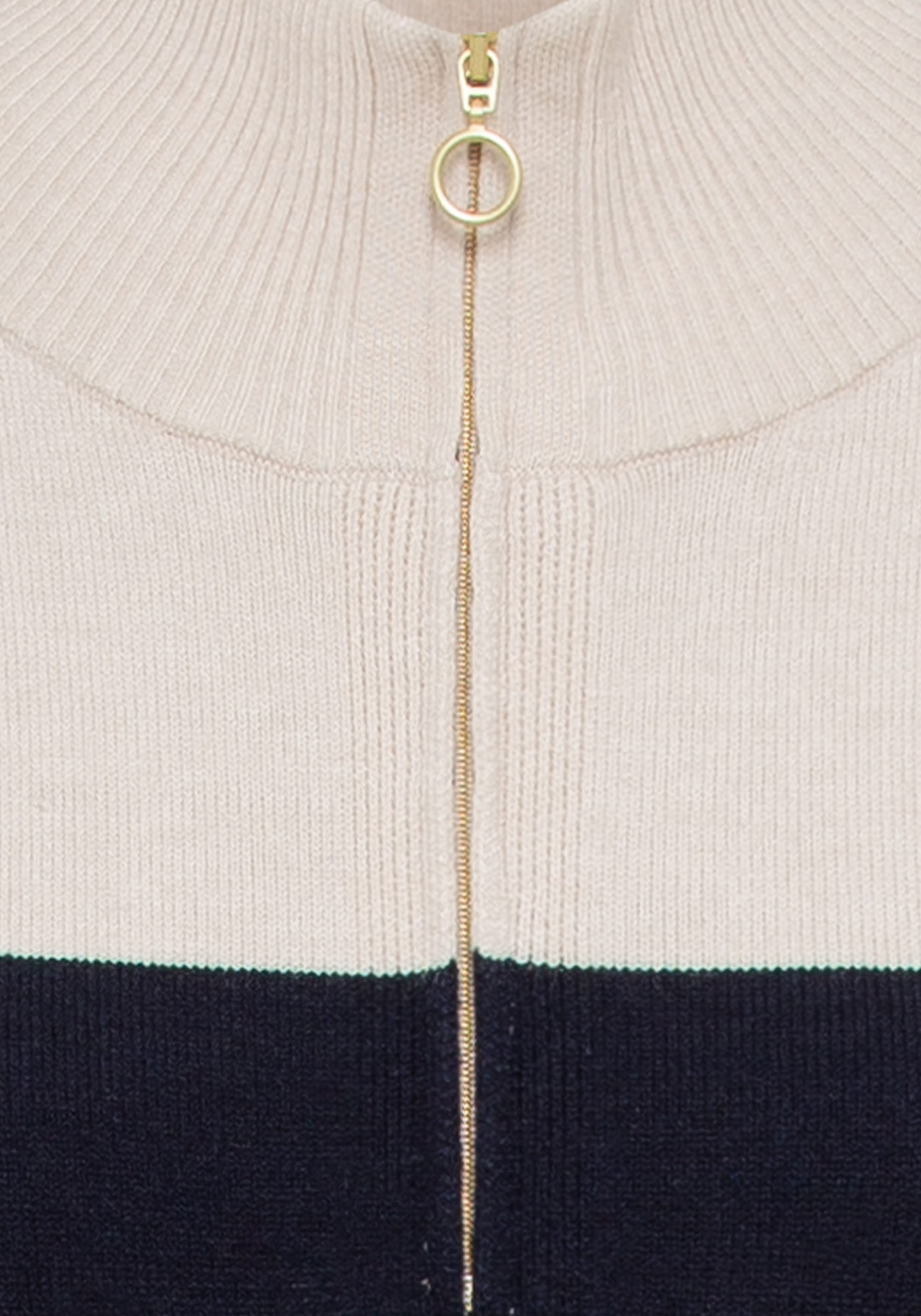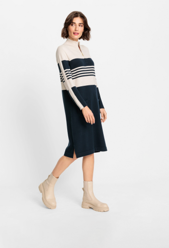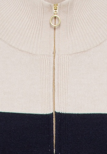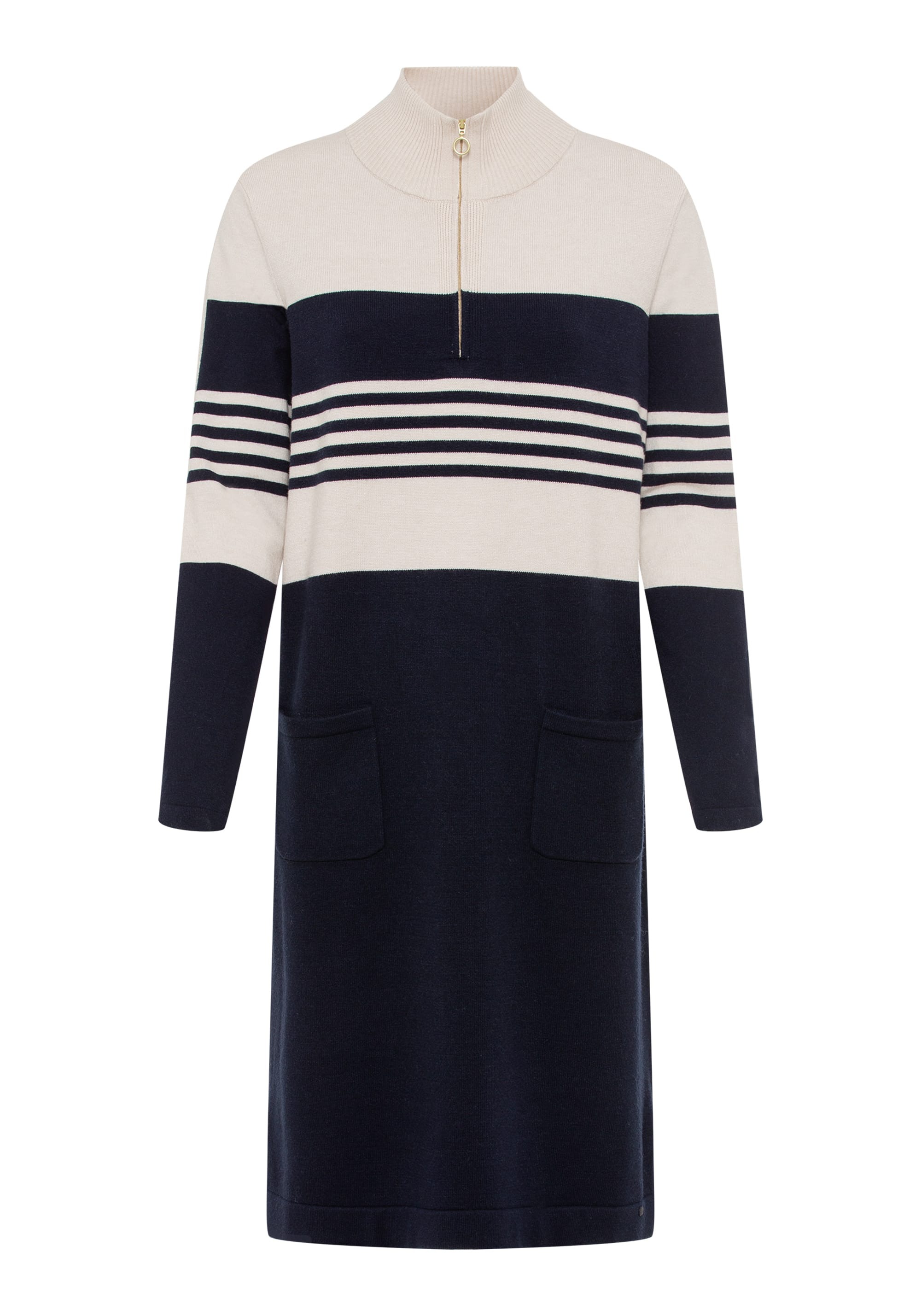 Классический вариант платья-свитера в спортивном стиле. Приятная к телу модель длины миди с двумя передними накладными карманами и ложным вырезом на молнии 1/4, дополненным молнией матового золотистого цвета.