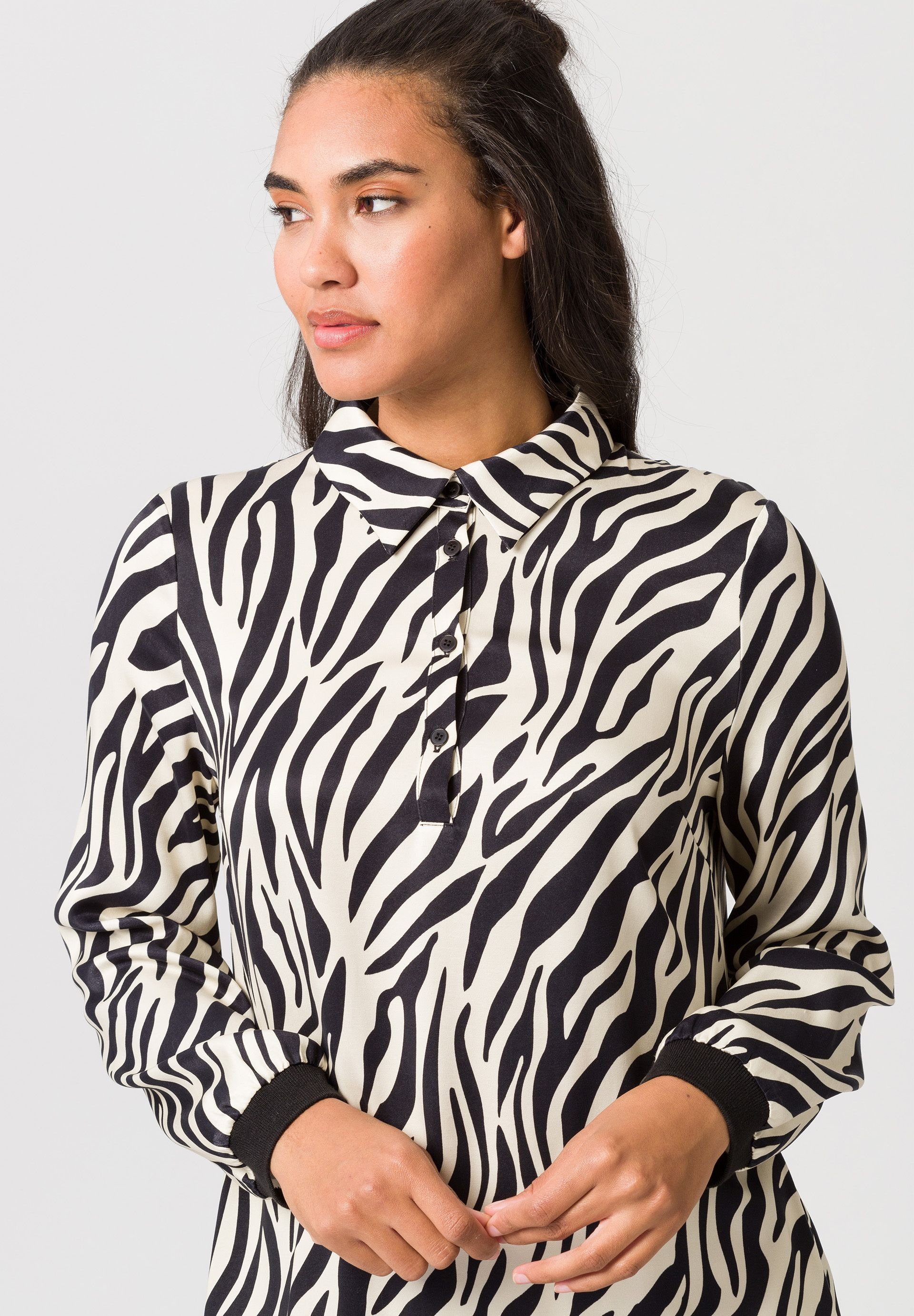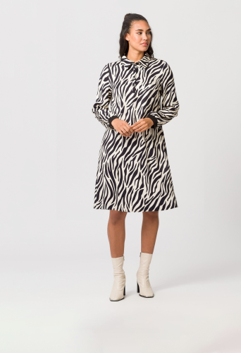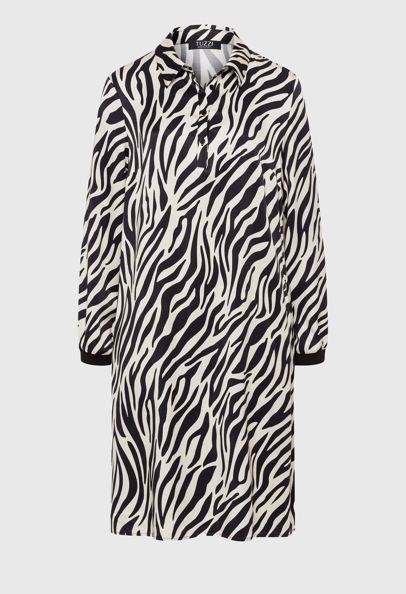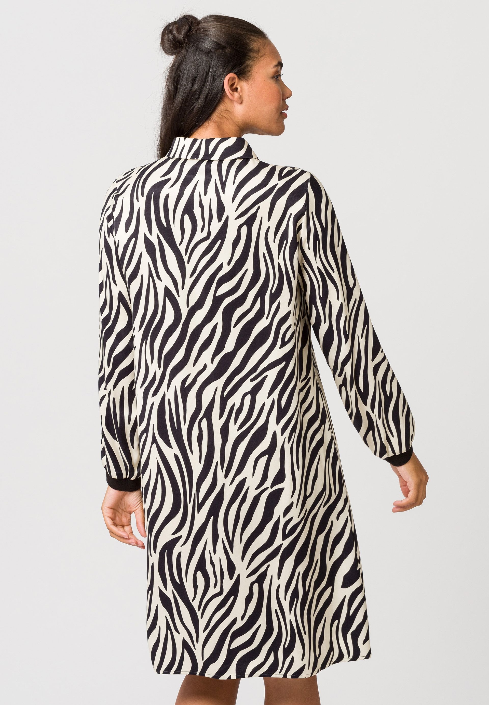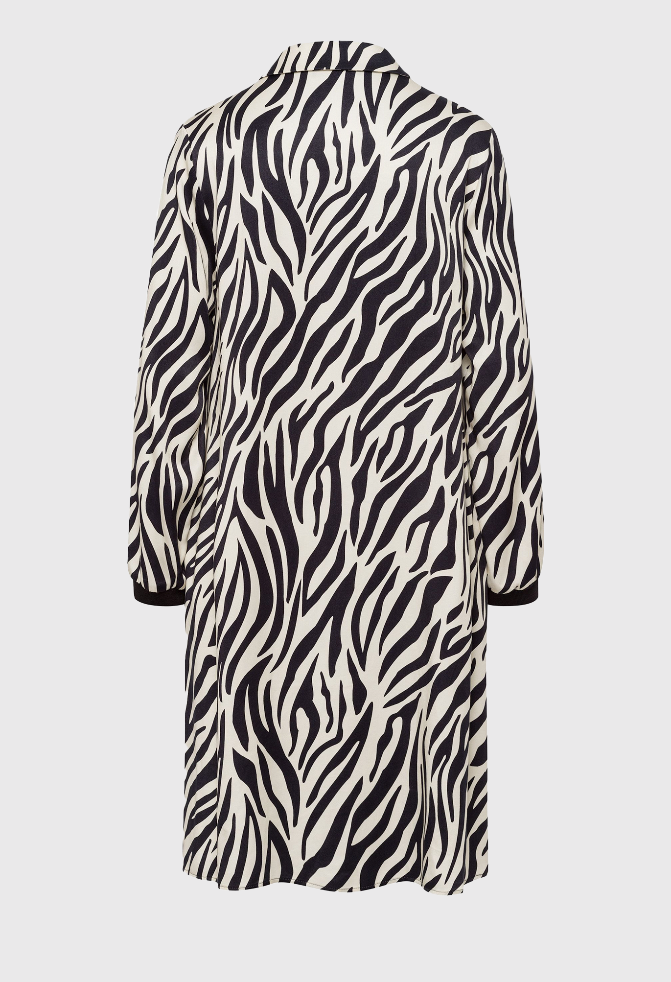 Платье женское с блузочным воротником и короткой планкой на пуговицах. Это платье сочетает в себе несколько модных тенденций! Модный анималистический принт, элегантный крой рубашки, спортивные ребристые манжеты – здесь объединены лучшие дизайнерские особенности, чтобы создать спортивное, шикарное женское платье. Струящаяся ткань купровискозы имеет матовый блеск, а в боковые швы встроены прорезные карманы. Отличная мода на каждый день.