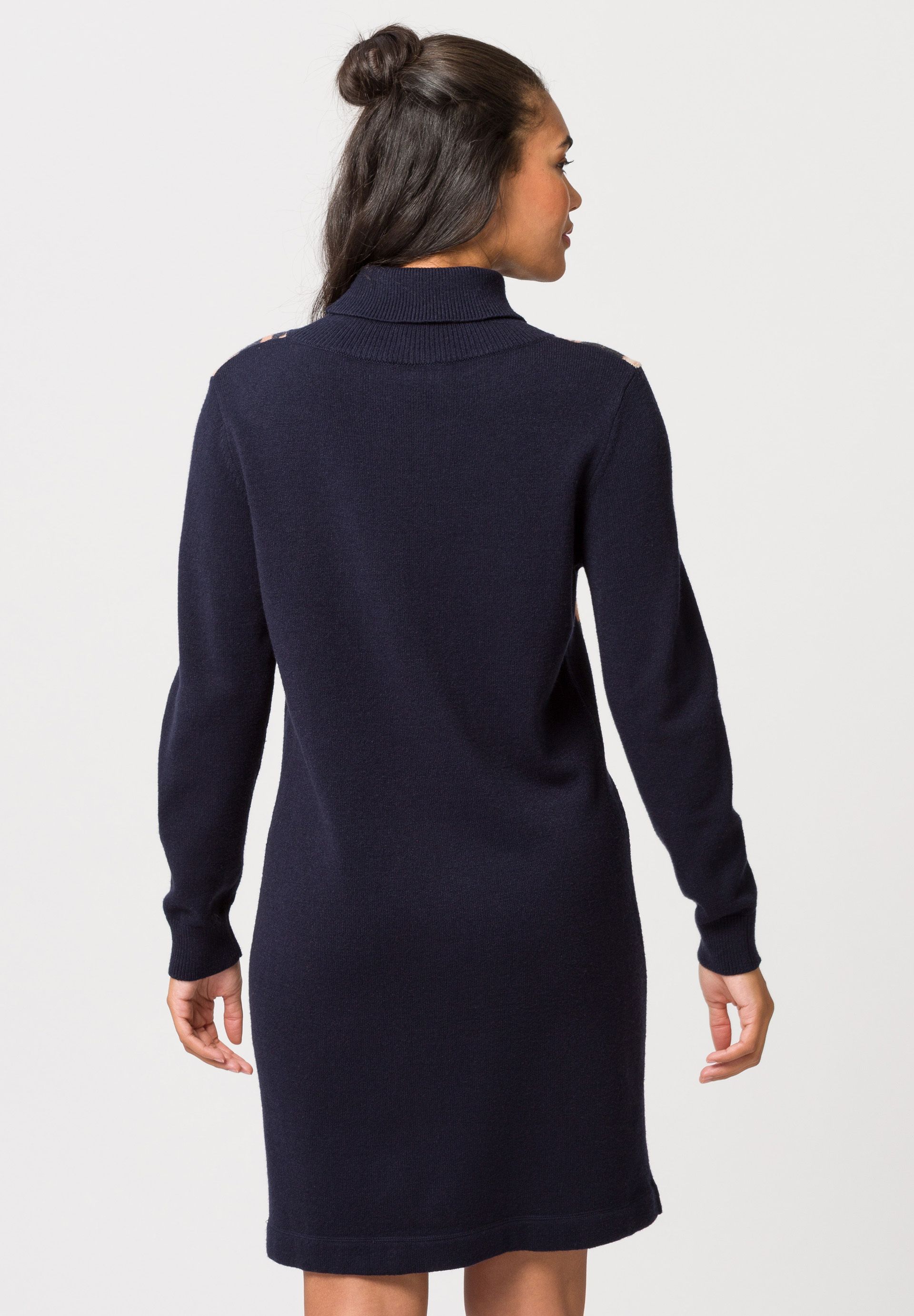 Вязаное платье женское с ребристыми манжетами на рукавах. Мягкая, тонкая трикотажная ткань с содержанием вискозы делает ее чрезвычайно приятной на коже, а облегающий крой делает ее очень комфортной. Водолазка в рубчик также согревает шею. Что особенно привлекает внимание, так это дизайн передней части с ярким узором по всей поверхности и сверкающими заклепками.
