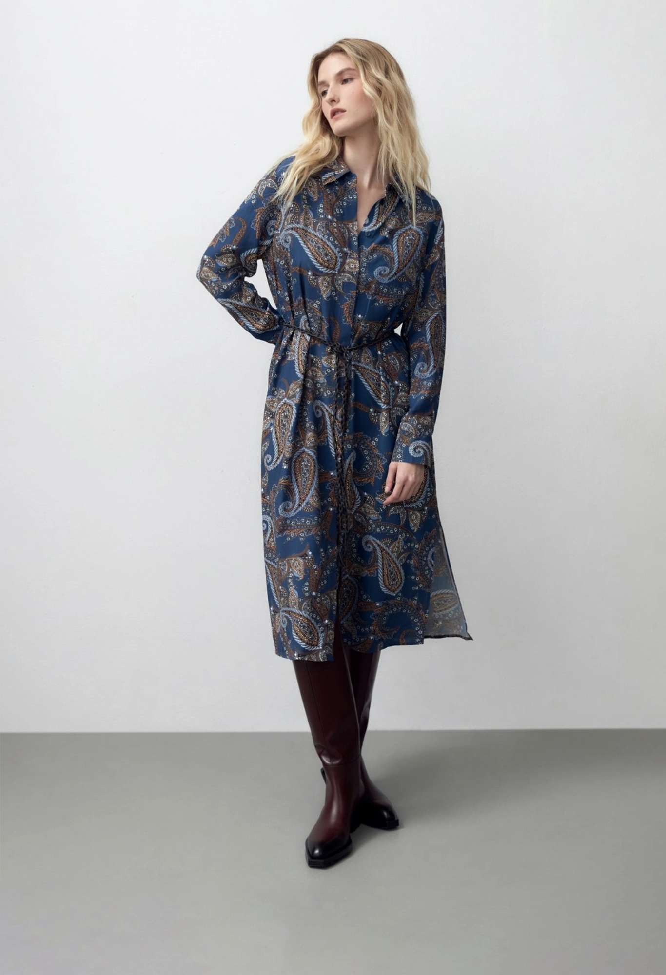 Платье-рубашка из 100% вискозы прямого, свободного силуэта длины миди с классическим отложным воротником и втачным рукавом полной длины на манжете. Застежка спереди потайная на пуговицы, по боковым швам разрезы. В комплект входит крученый тонкий пояс из экокожи для создания более приталенного силуэта.