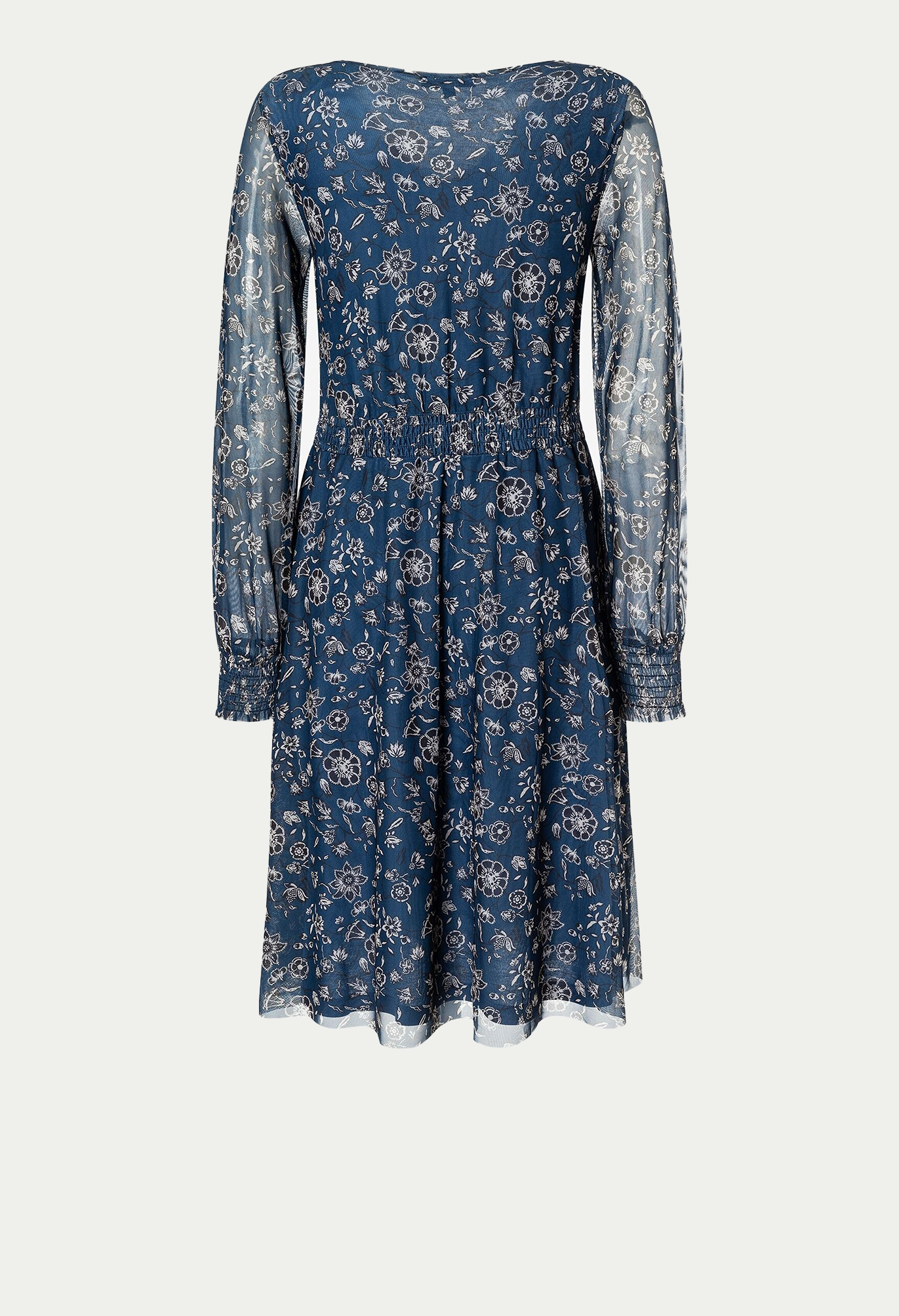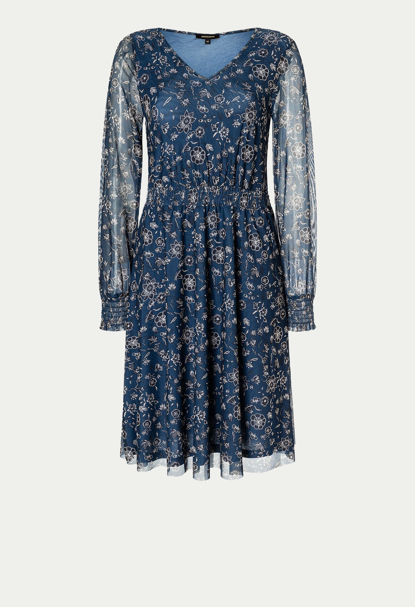 Струящееся сетчатое платье с современным цветочным принтом и резинкой на талии можно носить как с кардиганом, коротким пиджаком. Женственный V-образный вырез, длинные прозрачные рукава с присборенными манжетами. Эластичная талия, непрозрачная подкладка. Длина по размеру 44 - 104 см.