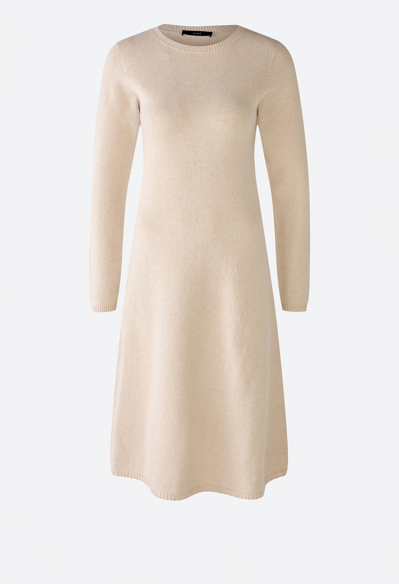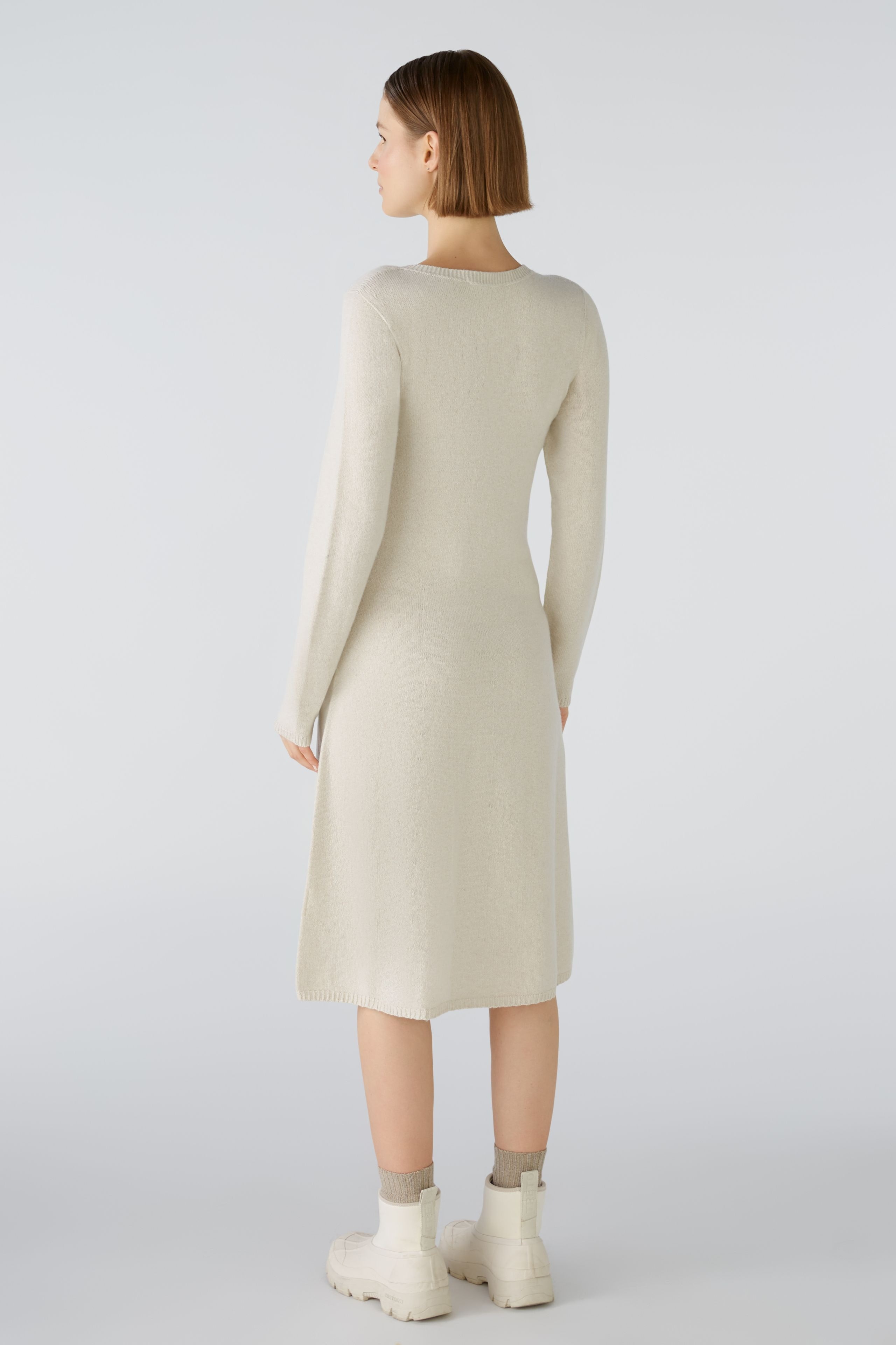 Трикотажное платье бесшовной вязки. Приталенный топ, слегка расклешенная юбка, длина до колена. Круглый вырез. Удлиненный рукав. Узкие ребристые манжеты на воротнике, рукавах и подоле. Длина для размера 42 - 106 см.