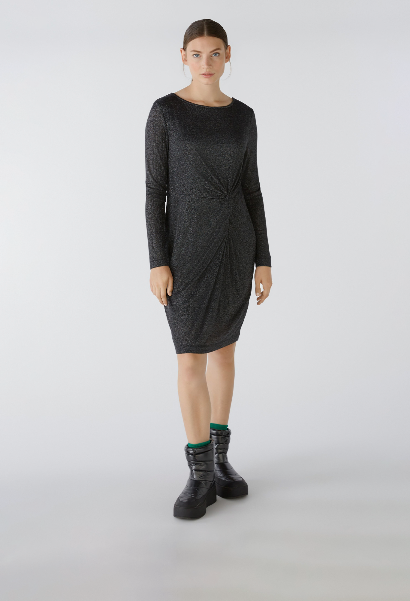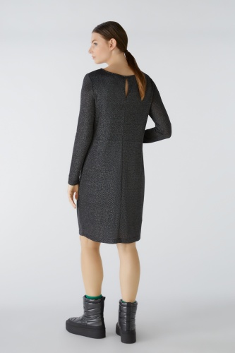 Комфортное платье из эластичного вискозного трикотажа с блестящей пряжью. Облегающий крой, длина до колена. Женственный круглый вырез. Небольшой разрез сзади, не застегивается, легко надевается. Трикотажная подкладка на теле Красивые рюши на талии со скрывающим эффектом. Длина для размера 42 - 92 см.