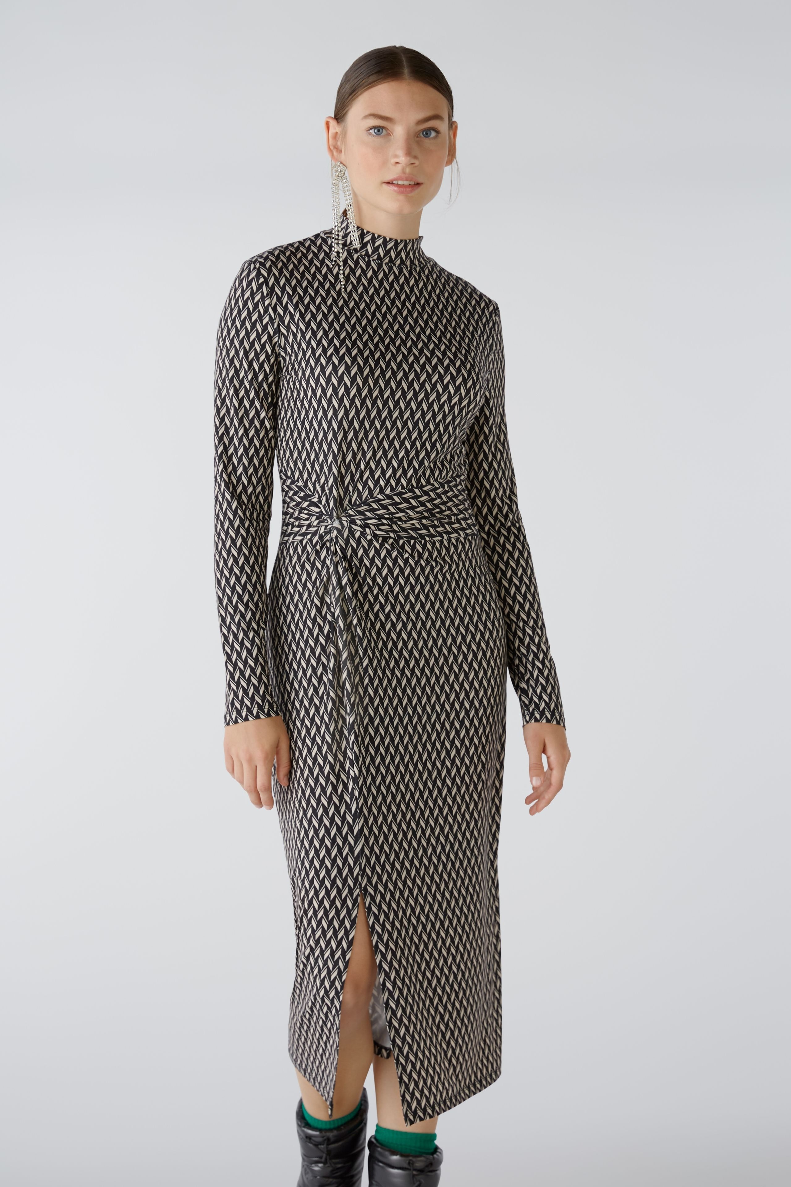 Облегающее платье миди с узлом на талии. Высокоэластичный, струящийся материал Silky Touch из переработанного сырья, с принтом по всей поверхности. Приталенный крой, длина миди, скрывающий узел на талии. Узкий воротник-стойка, облегающий шею. Без застежки. Разрез чуть выше колена для большей свободы движений. Длина для размера 42 - 116 см.