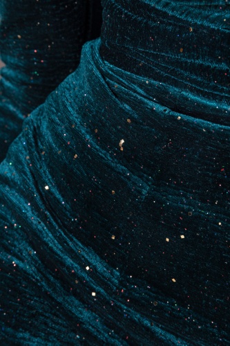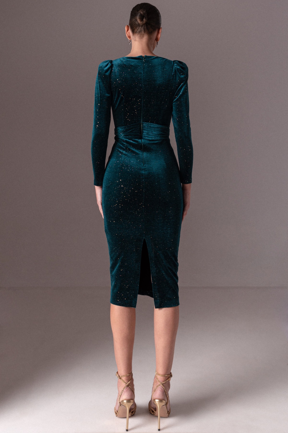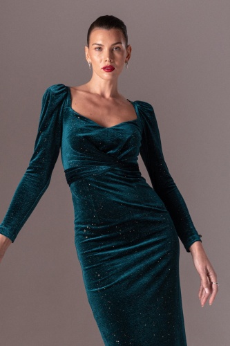 Бархатное платье с пышными рукавами. Длина миди, с длинными рукавами, облегающий дизайн, застежка-молния.