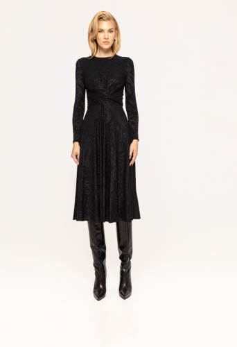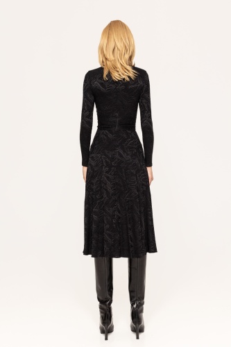 Платье миди жаккардовой вязки с длинными рукавами. Воротник у основания шеи. Облегающий дизайн.
